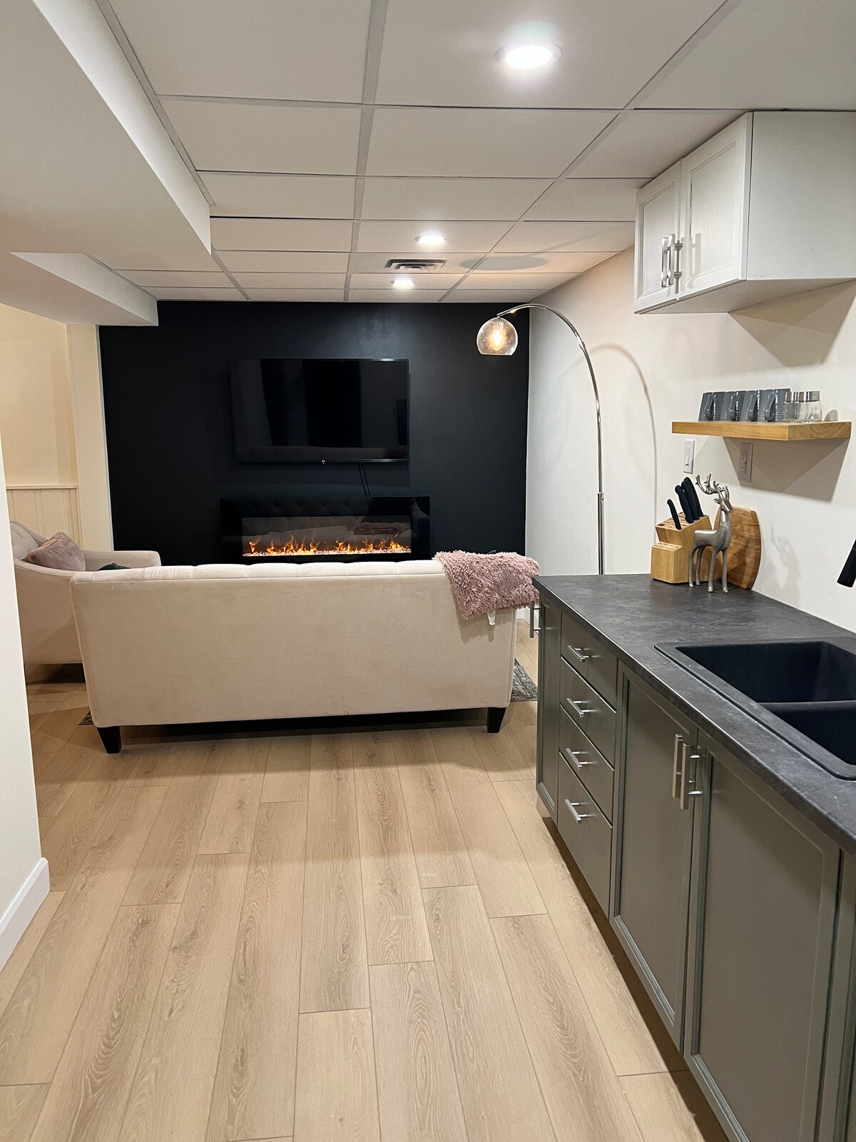 The living area has a dedicated dining area, entryway nook for your coats & shoes as well as the immersive cinematic 75” TV with separate sound system. The decor is filled with all the things that remind us of Orillia. It’s an area that draws you in and begs you to cozy up for hours!
