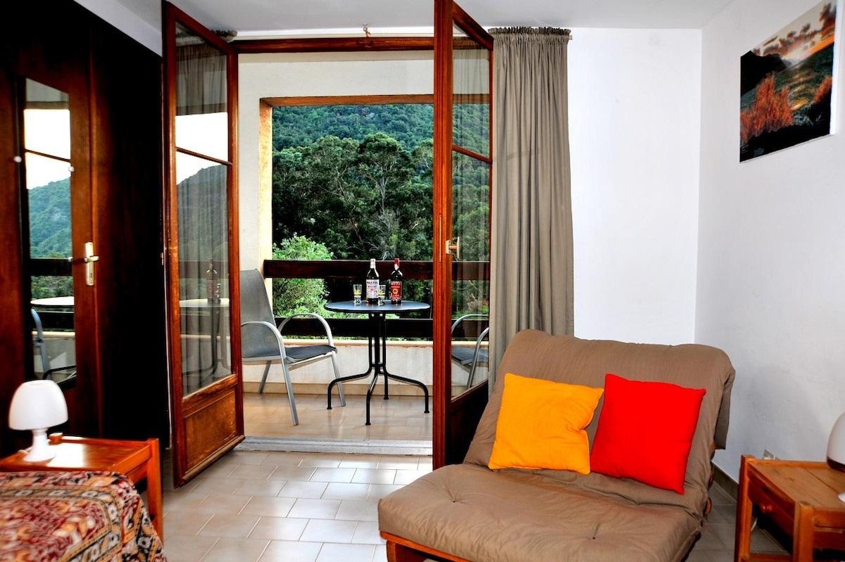 In the heart of the village and the Gulf of Porto this studio consists of a large living room with a 140cm sofa bed, dining area, bathroom with independent toilet as well as a semi-covered terrace with views of the shore and the tower of Porto.