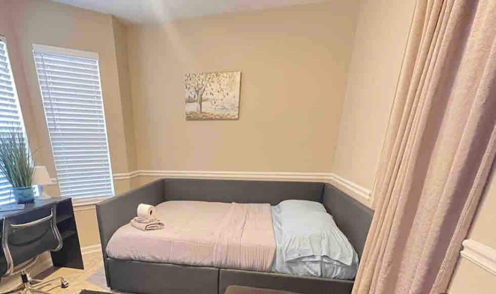 This is a smaller space meant for ppl on a budget or trying to save money they is no normal bed but as shown in photos a over sized chaise which may or may not be suitable for you so ppl access that when booking this listing their is a private half bathroom in the room which is a plus this is not a room to bring a lot of bags or luggage 🧳 hence the size. by booking this room you agree you have read all and that you are okay and fully understand the size and purpose of this room and that no refunds are allowed again this room is great for short stay ppl with layover flights and wanna relax but not pay a ton of money or someone who is in a bind and needs a long stay and does mind the minimalist life style