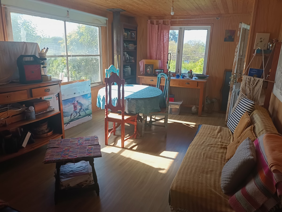 Cozy cabin on a plot in the middle of the countryside, on Santo Domingo beach. Very close to the Yali and Maipo Wetlands, Leyda Valley Vineyards, Casa del Poeta Pablo Neruda and the Poets' Coast, as well as Tricao Park.