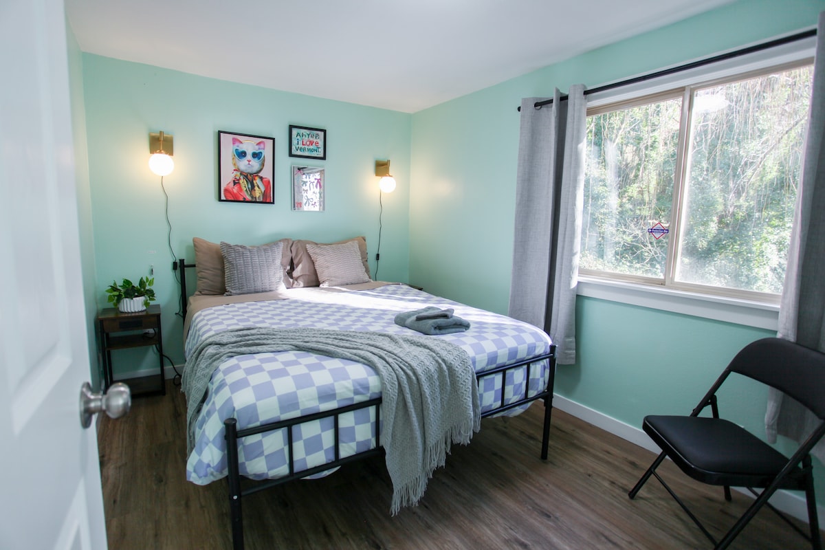 The Forest Apartment is a centrally located Airbnb Triplex perfect for budget travelers. Our location counts 11 private rooms over 1900 sqft, with 2 baths, complimentary toiletries, & a fully stocked kitchen. Each private room is equipped with a key, fast internet, towels, chair, fan in summer, space heater in winter, clothes rack, & mirror. Your room is located in the top unit and measures approximately 8x12 with a queen-sized bed and a window facing the surrounding forest & the beautiful bay.