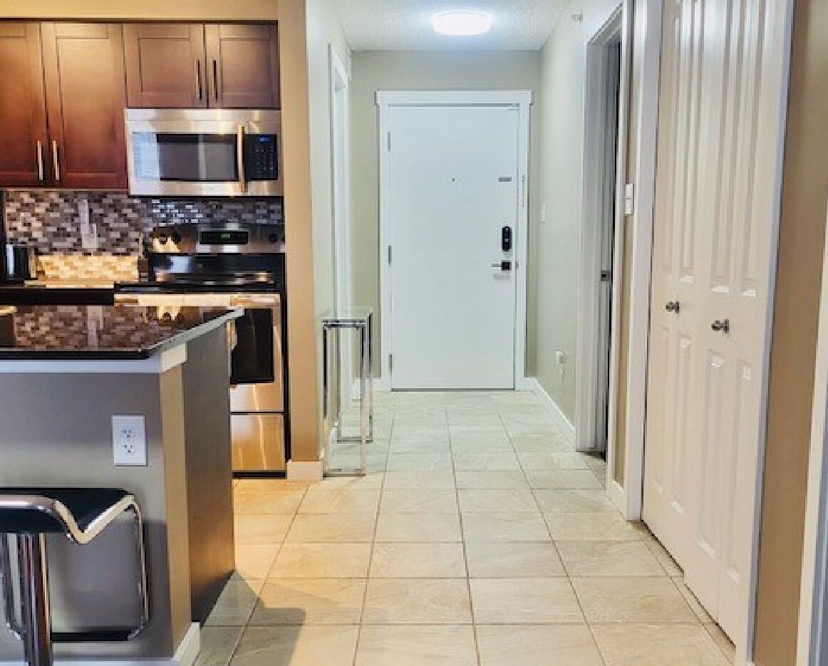 Inside the suite you find a spacious entrance/sitting area and laundry with built in storage cabinets; fully equipped kitchen complete with brand new appliances, including dishwasher and counter top and counter stools suitable for remote work; living room, modern bathroom; 2 spacious bedrooms with a walk in closet in the master bedroom; approved safety windows for ease of egress; and hallway with custom made shelves.