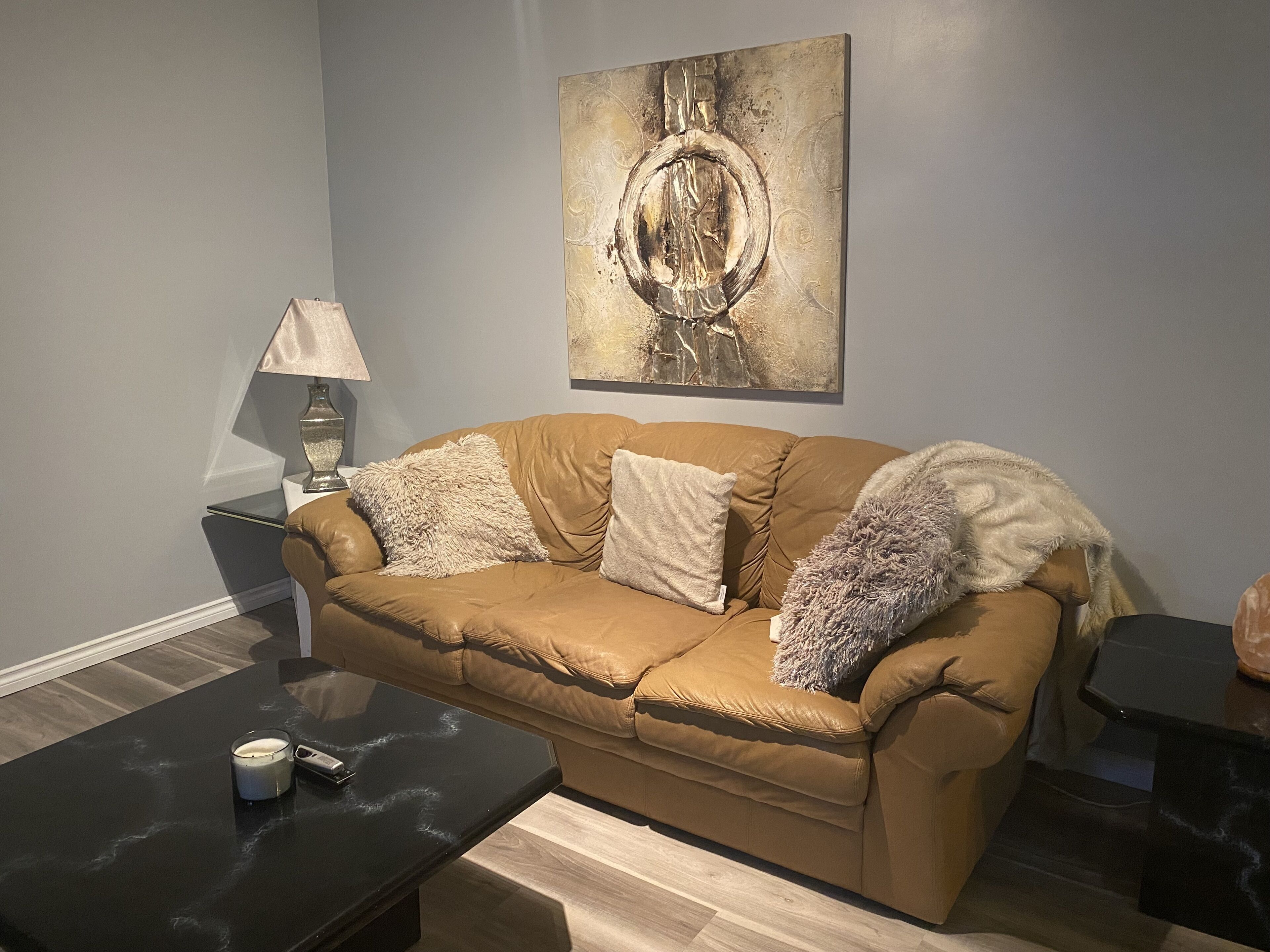 Fully private, new, one-bedroom basement suite with private entrance, kitchenette, living area, new queen sofa sleeper, laundry, and bath. Accommodates up to 4 guests.
