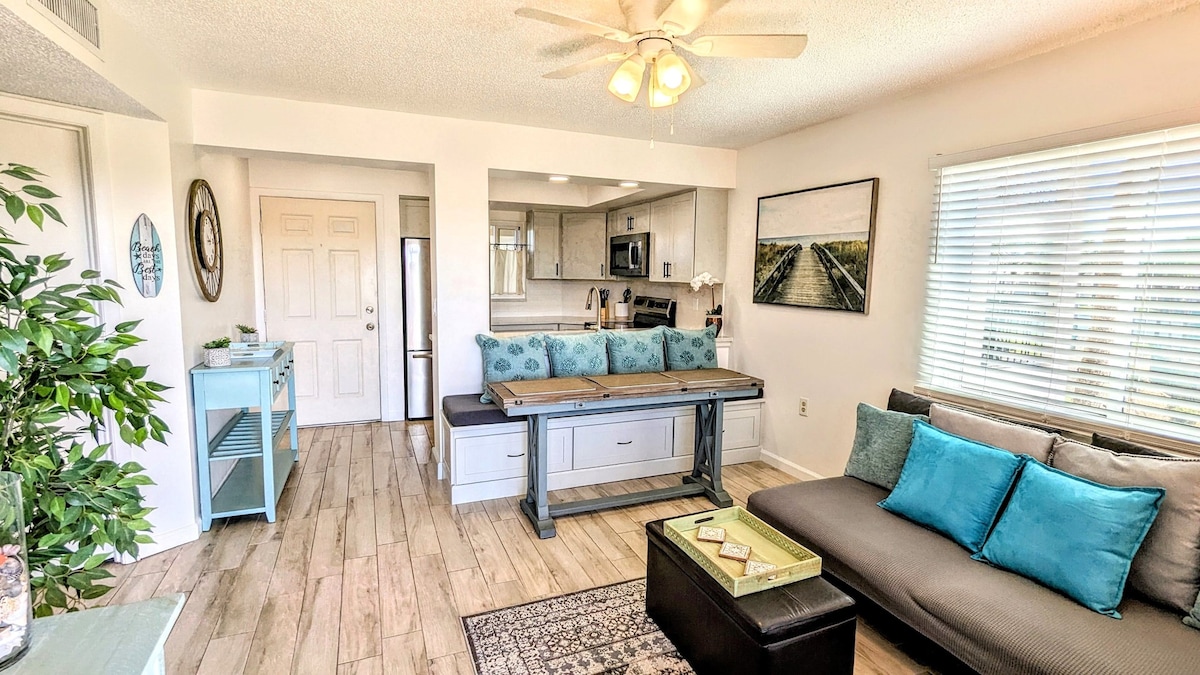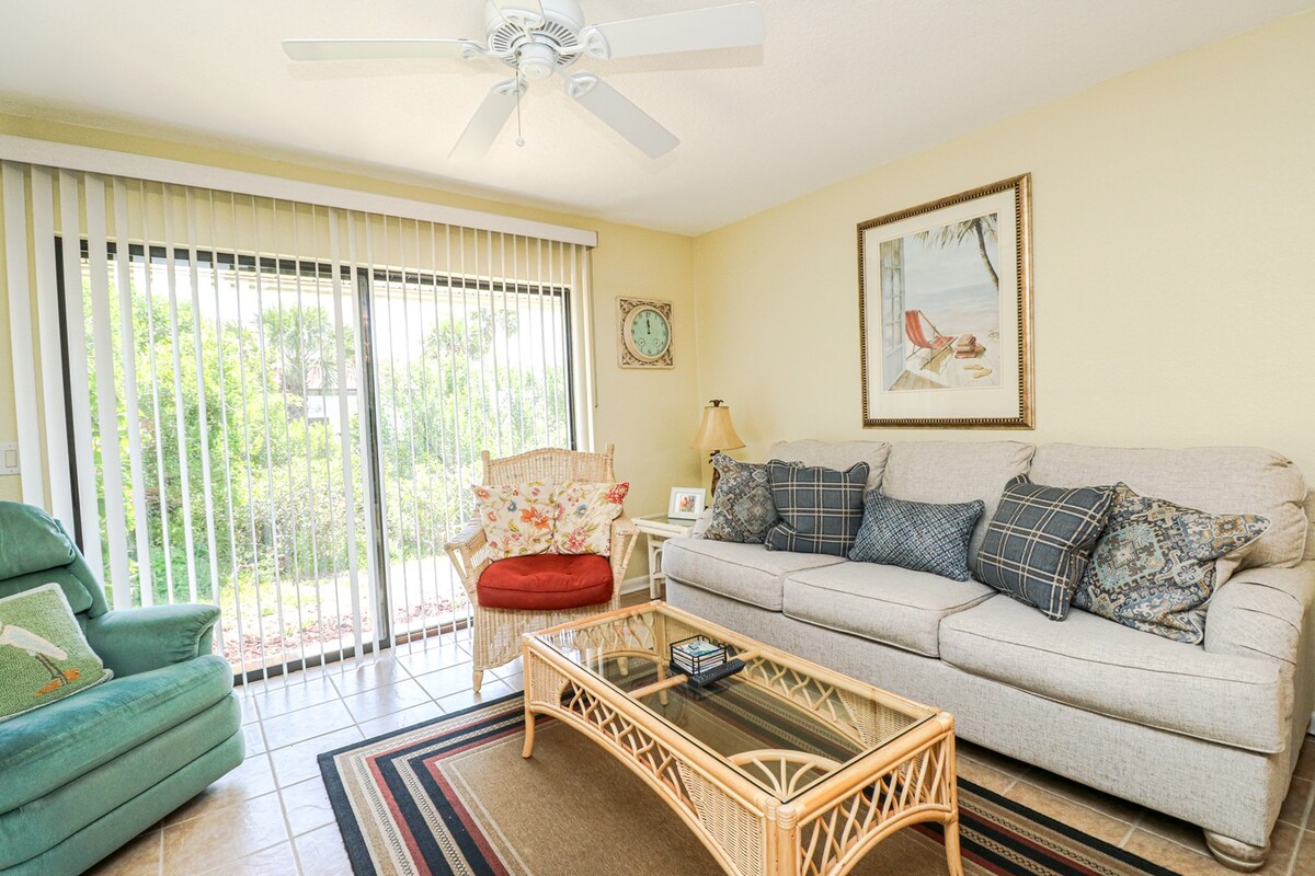Start your days on the patio outside our living and dining area. Here you can enjoy the balmy air, salty breezes, and the sound of the surf . . . all while enjoying free WiFi for your smartphone or laptop! Cradle a cup of coffee while pelicans soar overhead on their way to the ocean, early fishermen stroll over to the nearby ponds and docks to try their luck, and another perfect Florida day breaks.