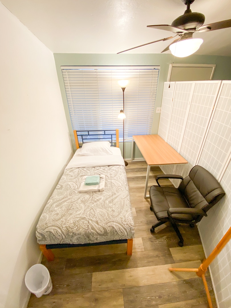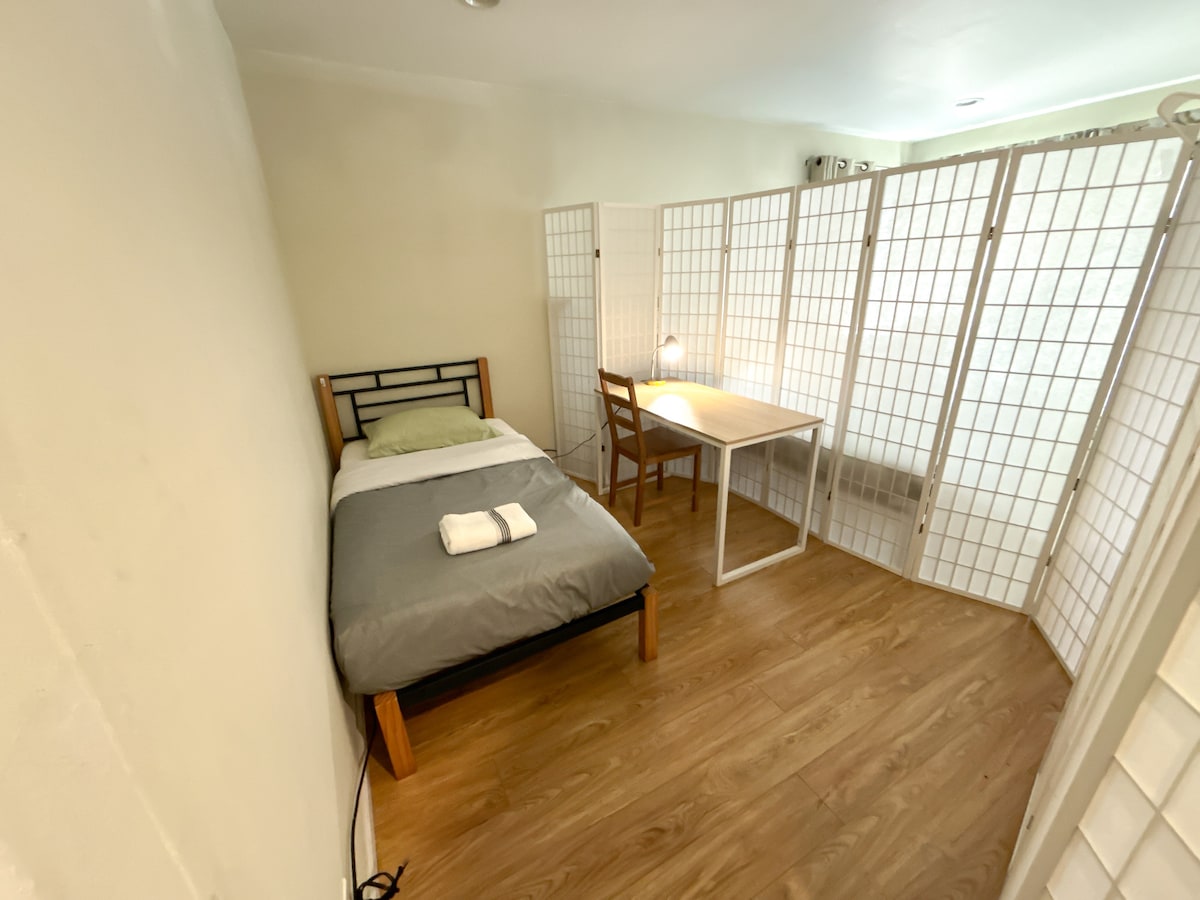 This partition room gives off a cozy and flexible feel with the use of a screen divider, creating a private space within an area. The light streaming through the window adds a warm and inviting ambiance, complemented by the floral curtains that give a touch of elegance. The room has a simple yet functional layout, with a comfortable bed, bedside table, and a desk by the window, perfect for working or relaxing. It’s ideal for someone looking for a quiet and comfortable space.
