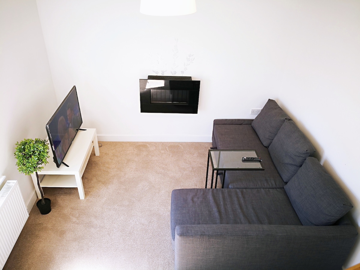 The living room is sizeable, with a comfortable three-seater corner sofa and a TV—licensing covered.