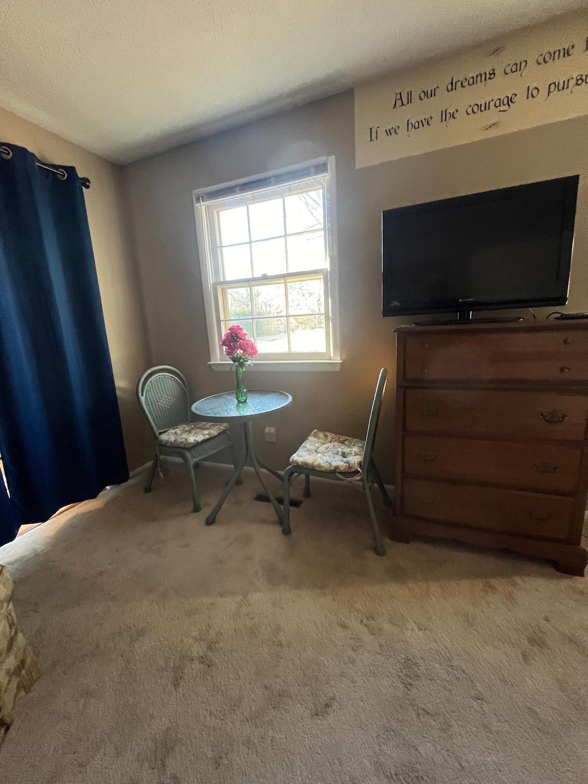 This is a average size non smoking room. It has a queen bed & 2 dressers. You will have a 40” TV with Roku. The closet is long & has 3 large shelf’s & enough room to put a suitcase under it. A twin mattress can be put on the floor for a very short term stay for $10/night