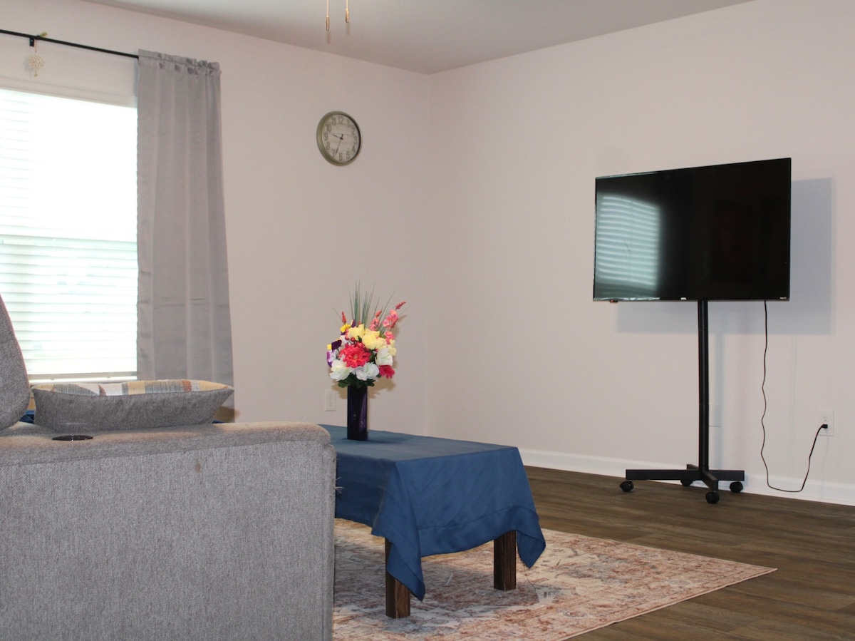 The non smoking living room is completely closed off with bi-fold doors. It has a cozy brown love seat & Queen sized bed. The tv is beside bed & has cable & Fast speed internet You have full kitchen privileges. Also you’re welcome to use dinning room & screened in porch & deck. Washer & dryer available for $3/load