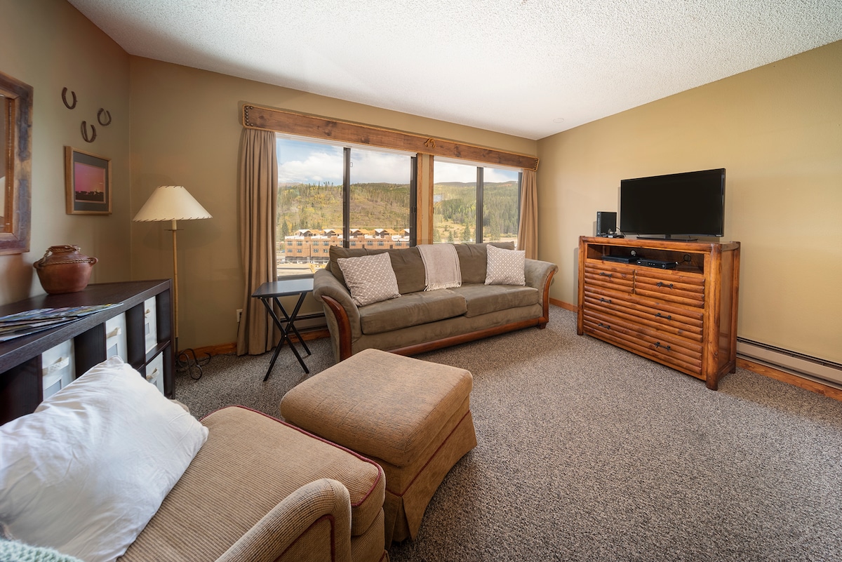 Updated 3rd floor condo is close to clubhouse, 1 block walk to downtown & on the free town shuttle. New kitchen appliances and cabinets make mealtime a snap. Dining table has plenty of room and is open to the main living room with vaulted ceilings for additional light in the main room, new sofa, gas fireplace, flat screen TV and access to the private deck with a wonderful mountain view to celebrate the alpenglow as it highlights the Continental Divide.