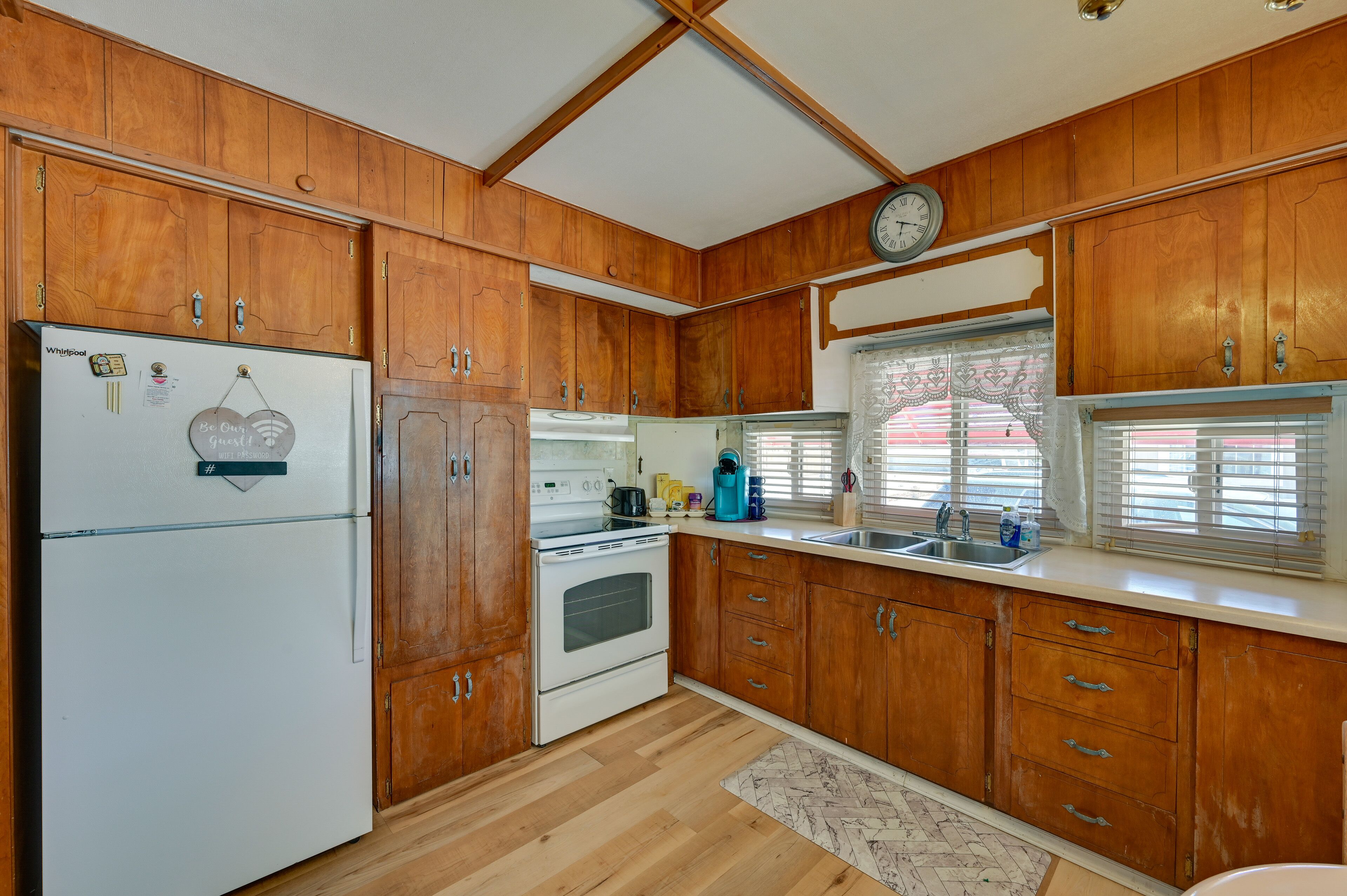 A living room, air conditioning, and a ceiling fan are featured at this 4-bedroom, 2-bathroom rental. Prepare a home-cooked meal in the kitchen, complete with an oven, a stovetop, a microwave, and paper towels. Other amenities include bed sheets, an ironing board, and heating.