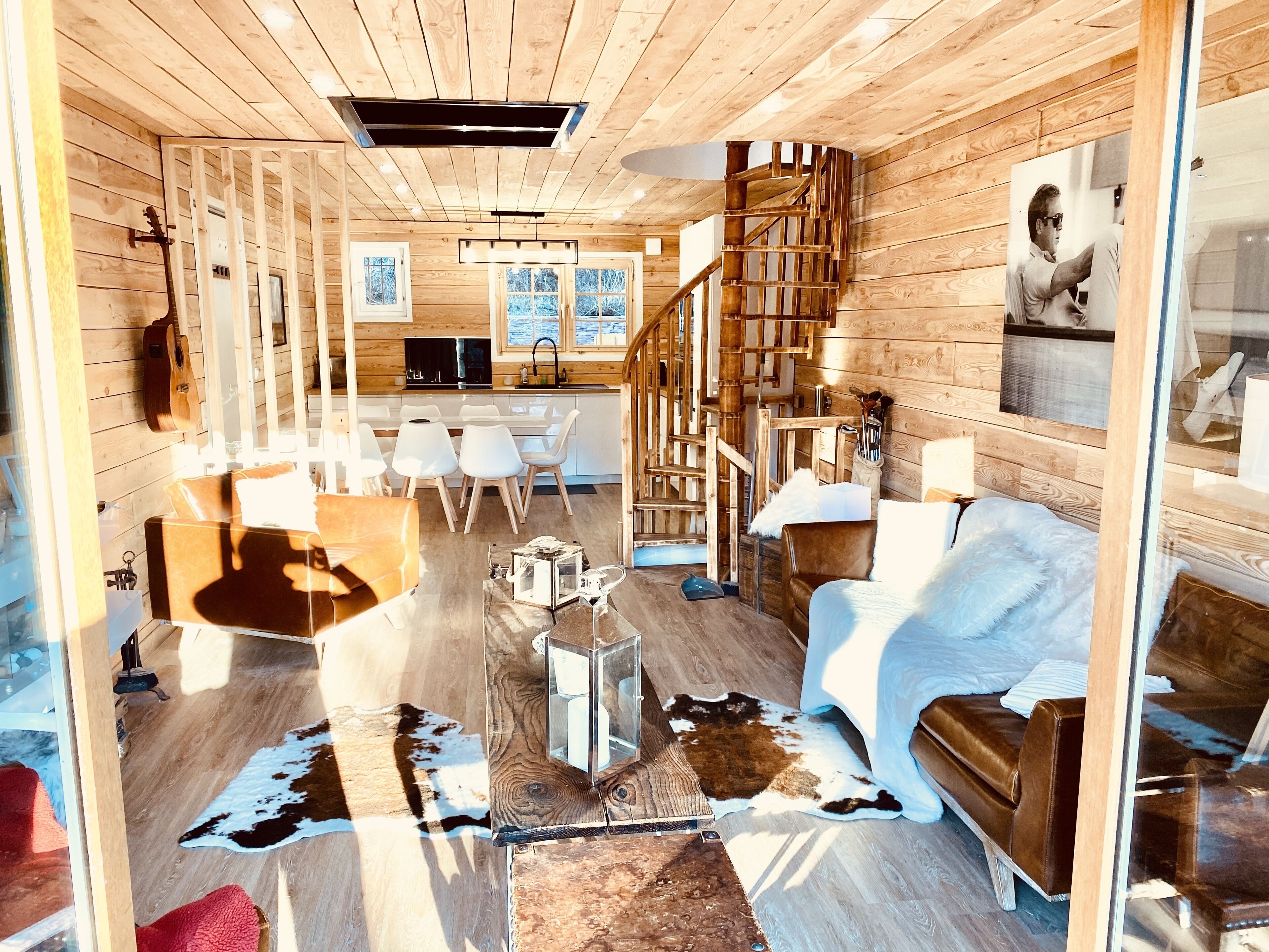 Inside, enjoy a fully equipped American kitchen (microwave oven & pyrolysis, dishwasher, induction plate XL, fridge / freezer, wine cellar) directly overlooking the living / dining room while old wood and its 4 meters of ceiling, its view of the ski area, the chapel, the square and its activities.