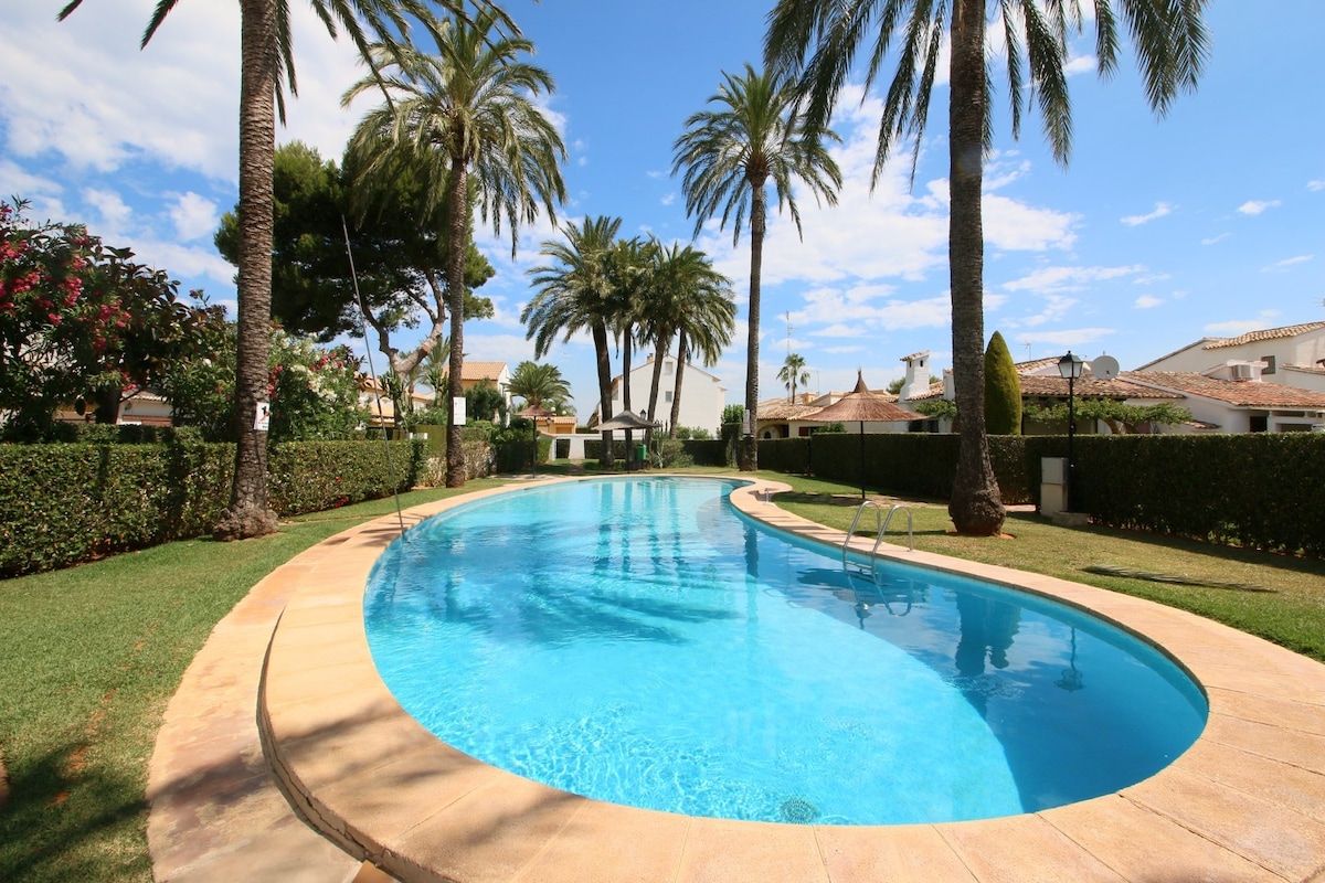 Holiday complex with communal swimming pool, just 150m from the beach and 3km from Dénia. In the surrounding area, there are places to shop, bars and restaurants nearby.Terraced house with two bedrooms, one double and another with two single beds. Recently renovated bathroom with shower, living-dining room with TV-SAT, Air Conditioning (facing the bedrooms to cool them) and exit to the small garden with furniture. It has an exterior staircase leading to the solar terrace.Open kitchen with American bar, ceramic hob, oven and fridge with freezer. To access the pool area, it is about 50m. Well-maintained area with lawn, palm trees and various other plants. There are parking spaces in front of the complex.Heating consumption (Gas, Oil or Pellets) is not included. In long-stay rates, electricity, heating (Gas, Oil or Pellets), wifi, sheets and towels are not included. The price of services will be according to the agency's conditions.