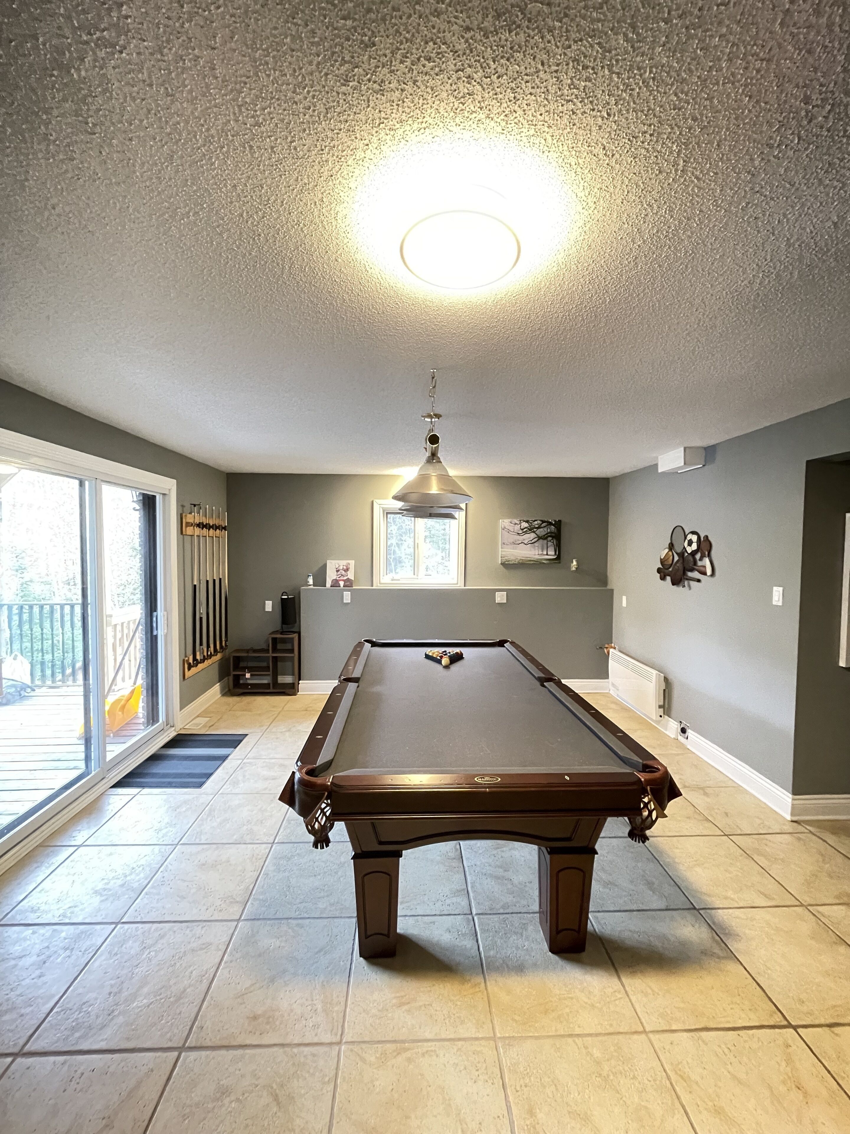 Lower walk-out: 75 inch Smart TV, with Wifi, Netflix, Youtube; massage table, kids 4 in 1 games table (foosball, pool, ping pong, air hockey), hammock and picnic table on walk-out deck.