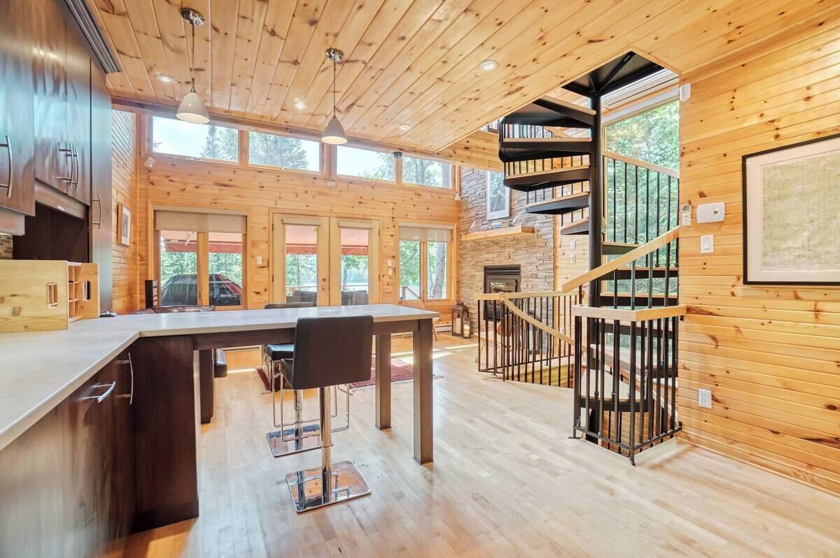 You will be charmed by this superb 4-season chalet! An impressive wood fireplace will allow you to create your own moment of escape. You will be delighted to share meals with family and friends while admiring the exceptional view of the waterfront directly from the dining room. Prepare delicious meals in a spacious, functional and fully equipped kitchen. The accessibility of the patio door opening onto the terrace will allow you to cook up your tasty meals outdoors on a BBQ even in the winter. The huge terrace allows you to be in the heart of nature and admire the magnificent sunset beaming over the vast expanse of water. At night, have a family bonfire outside, roasting marshmallows and admiring the stars or sit back peacefully in the hot tub and marvel at the moon above your heads. The moonlight fills the chalet with a warm glow all night.