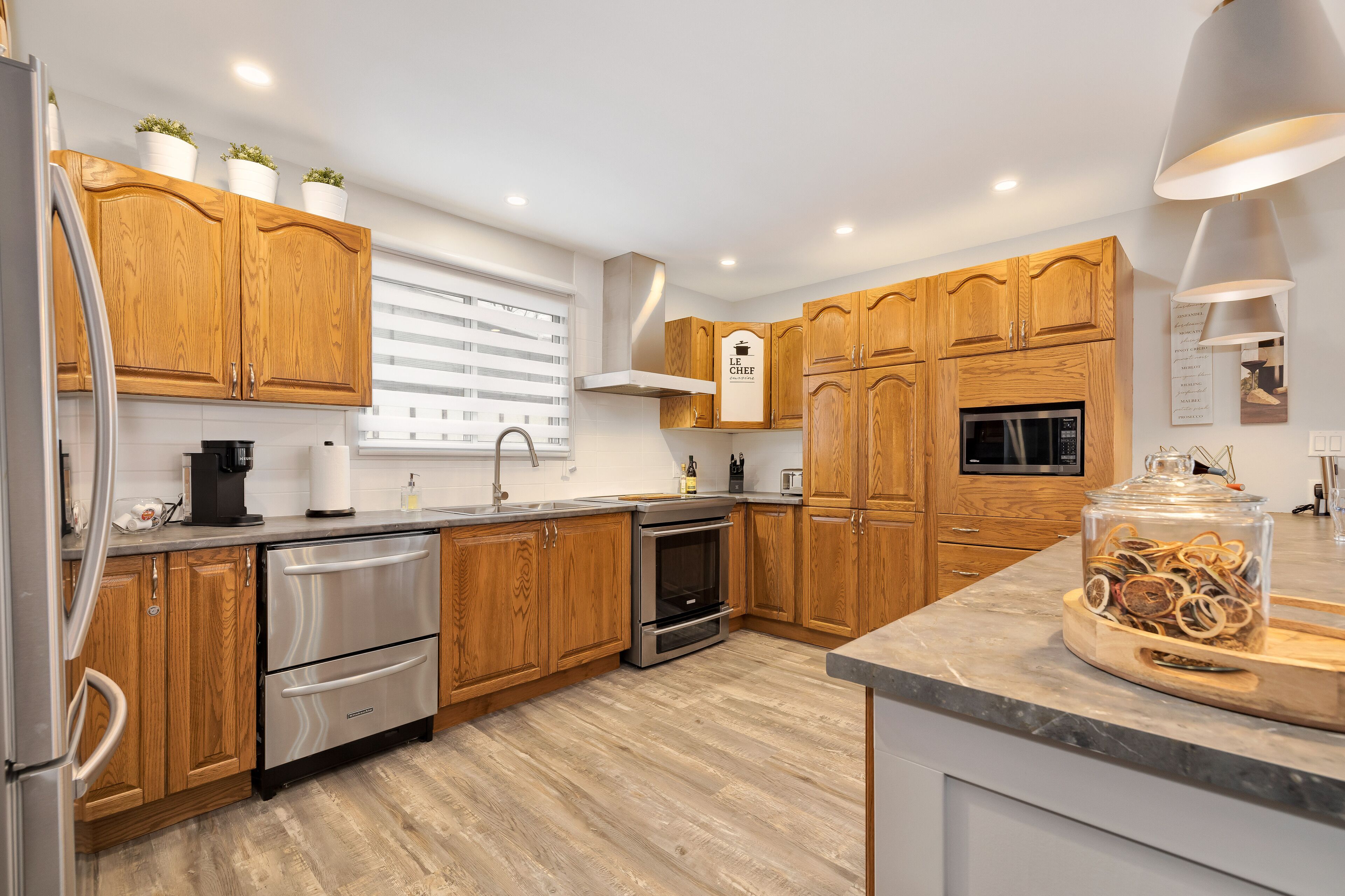 5 bedrooms and three full baths. Bright and modern kitchen with a large island that seats 5.