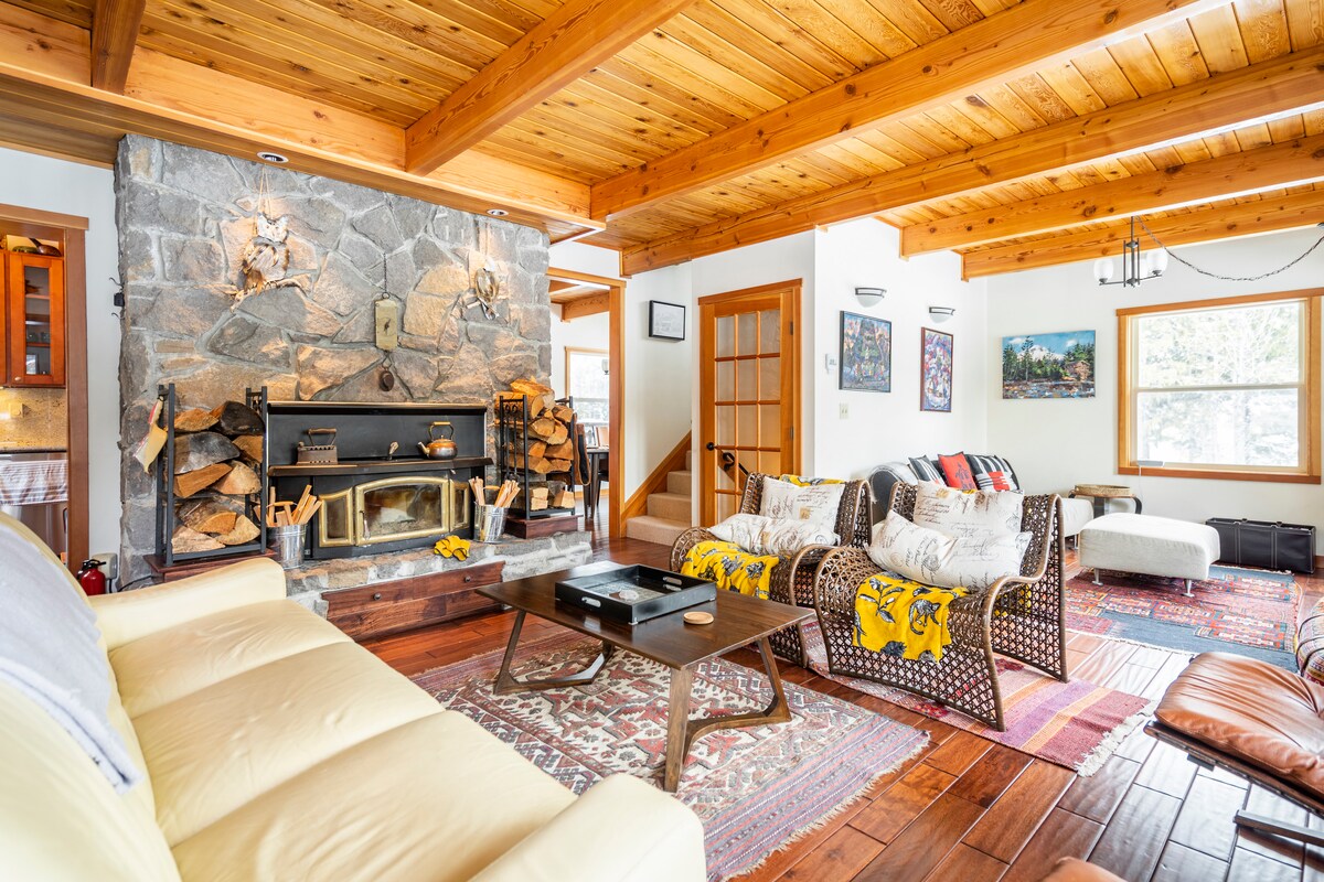 The lodge unfolds over three stunning floors, with the main living area radiating warmth and charm. An open floor plan, polished wooden finishes, and high ceilings create an airy feel that invites connection. Gather around the central wood-burning stove or luxuriate in the newly remodeled kitchen with exquisite marble countertops. The spacious farmhouse dining table is perfect for memorable meals with family and friends, while the living area’s comfortable sectional sofa and a 55" Smart TV set the stage for cozy movie nights.