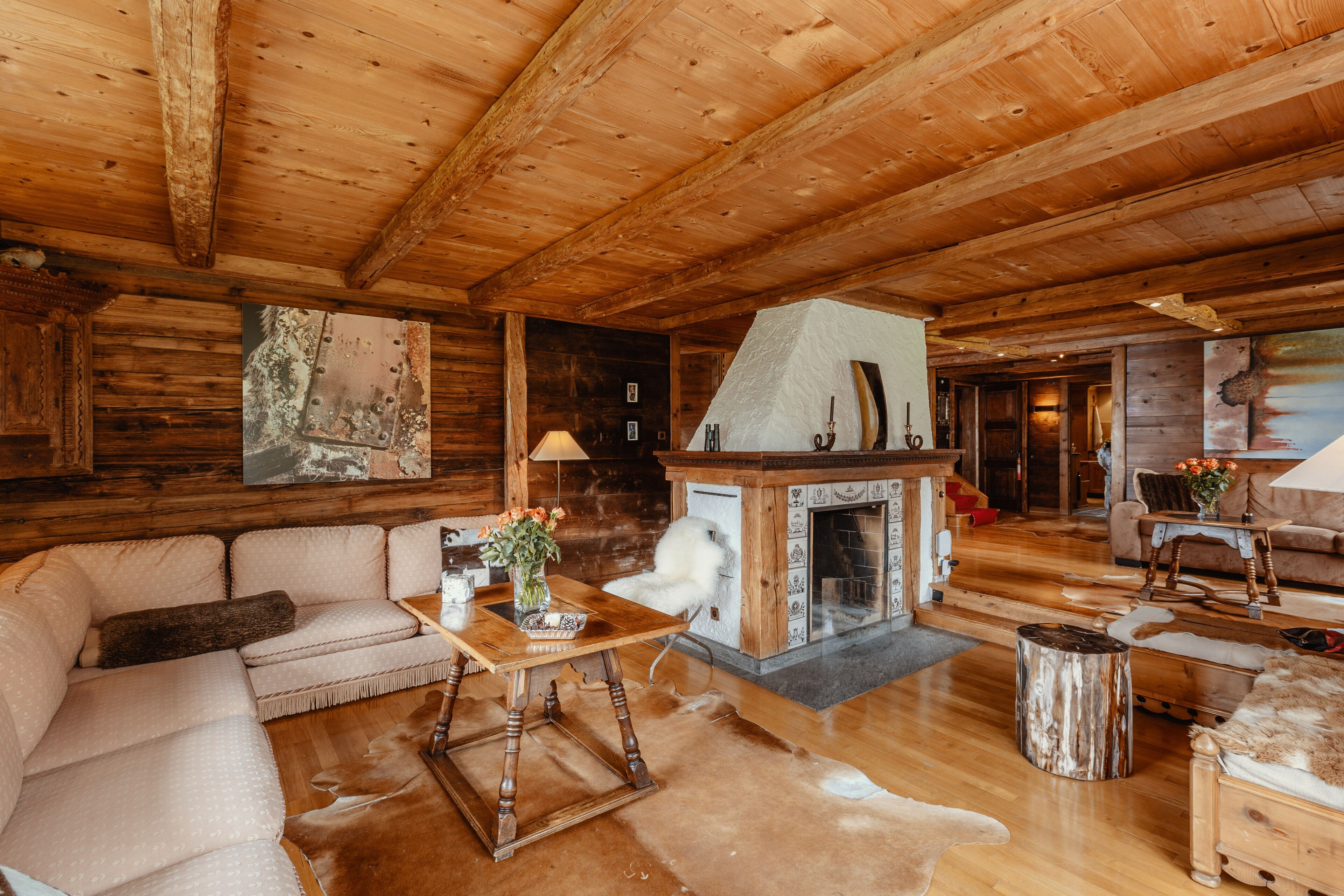 The chalet is built in Saanen and Tyrol alpine styles, with antique stoves and a traditional 'Stube' room. An example of authentic character, equipped with modern amenities.