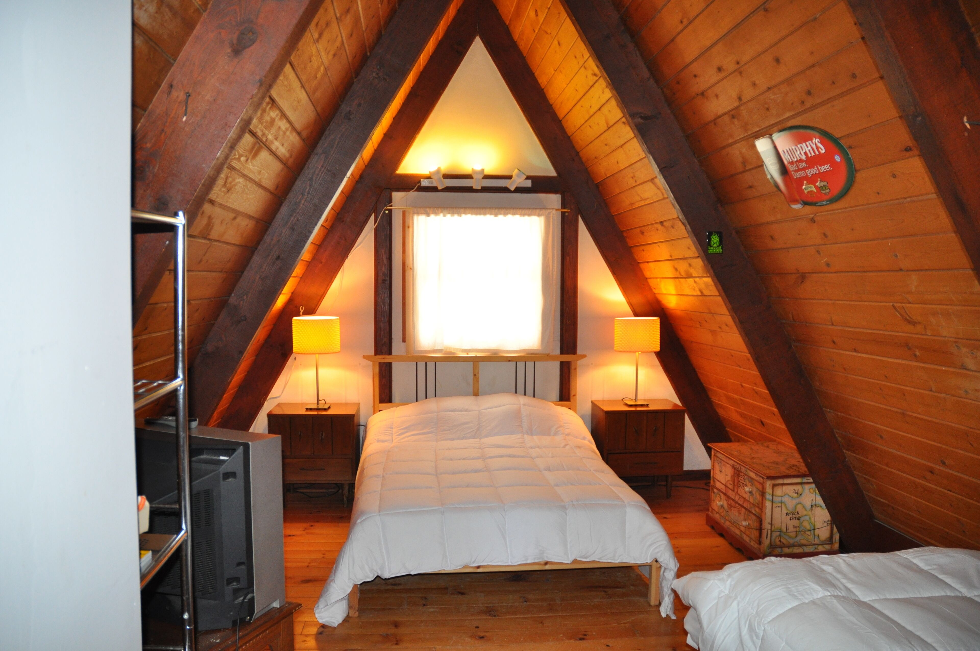 Back at the chalet, you'll find all the comforts of home and more. Curl up by the wood stove on a cool evening, or enjoy your favorite shows on the smart TV with satellite/streaming channels. Stay connected with the property's high-speed WiFi. In the fully stocked kitchen, you'll find everything you need to prepare delicious meals, from the stove and oven to the refrigerator, microwave, and dishwasher. Savor your culinary creations at the dining table, or step outside and dine al fresco. With air conditioning, heating, and linens provided, you'll be able to relax in comfort throughout your stay. Whether you're seeking a peaceful retreat or an adventure-filled getaway, our chalet in Hunter is the perfect home base for your Catskill Mountains vacation. There is a bedroom with a queen and single bed. There is also an open loft with a full and single bed.