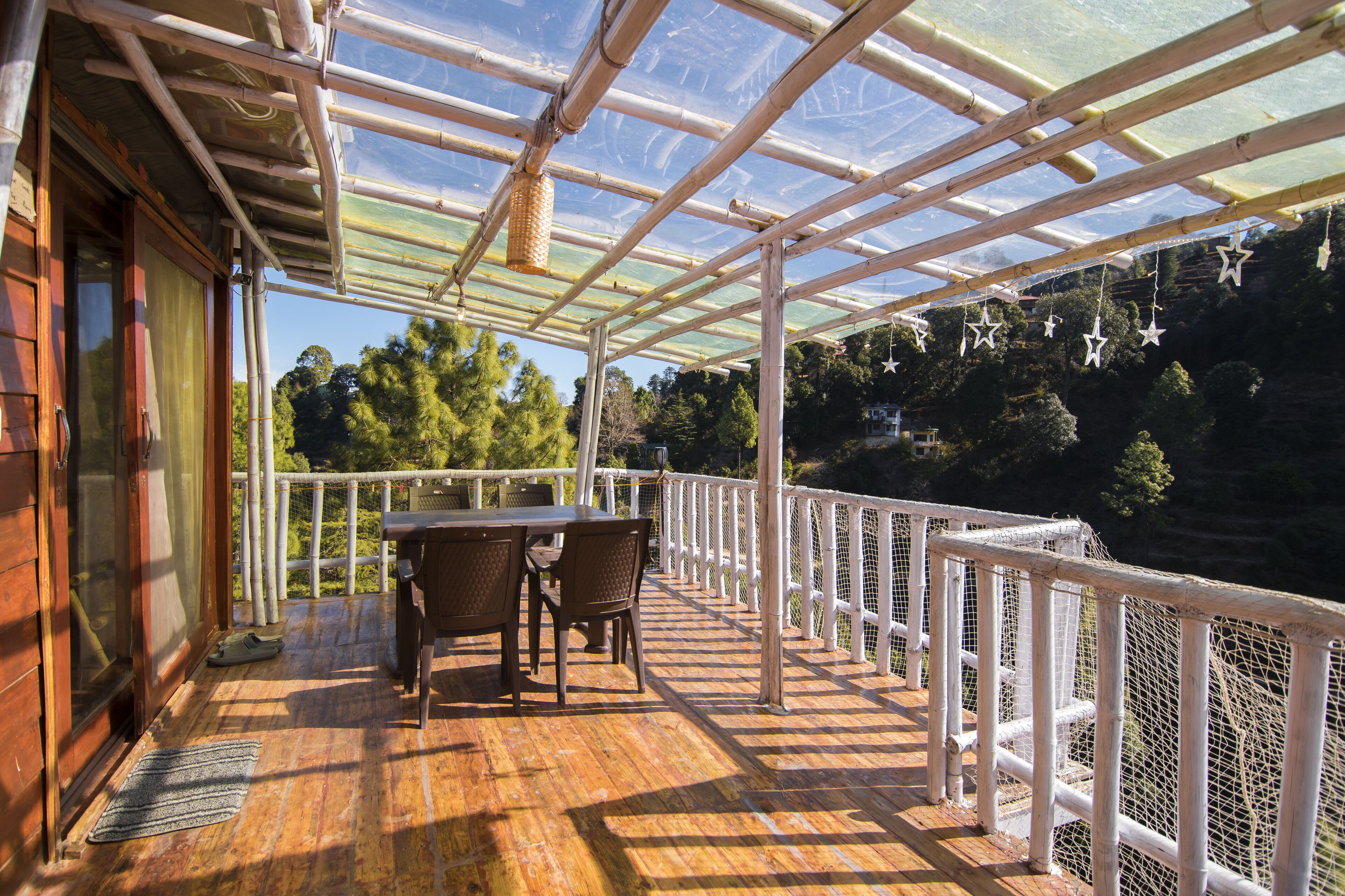 The room on first floor has a large balcony overlooking the gushing river and the himalyan peaks.