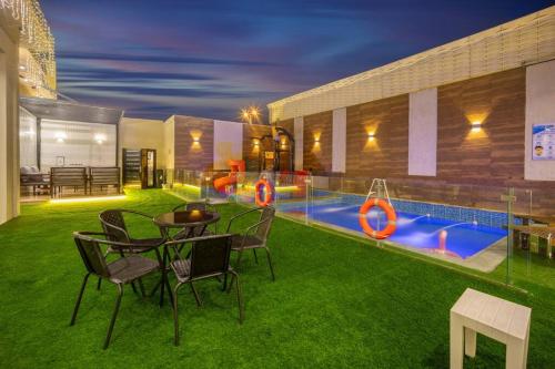 أكواخ الردسي in Al Kura provides accommodations with water sports facilities, a rooftop pool, and an indoor pool. There's a private entrance at the chalet for the convenience of those who stay. The chalet features rooms with air conditioning, free private parking, and free Wifi. The chalet provides guests with a balcony, pool views, a seating area, satellite flat-screen TV, a fully equipped kitchen with a microwave and a fridge, and a private bathroom with hot tub and bathrobes. A minibar and kitchenware are also available, as well as a coffee machine and a kettle. At the chalet complex, each unit is fitted with bed linen and towels. There is a coffee shop and bar. For guests with children, أكواخ الردسي provides an indoor play area, outdoor play equipment, and a baby safety gate. A water park and kids pool are available at the accommodation, while guests can also relax on the sun terrace. Floating Mosque is 24 miles from أكواخ الردسي, while Red Sea Mall is 25 miles from the property. King Abdulaziz International Airport is 25 miles away.