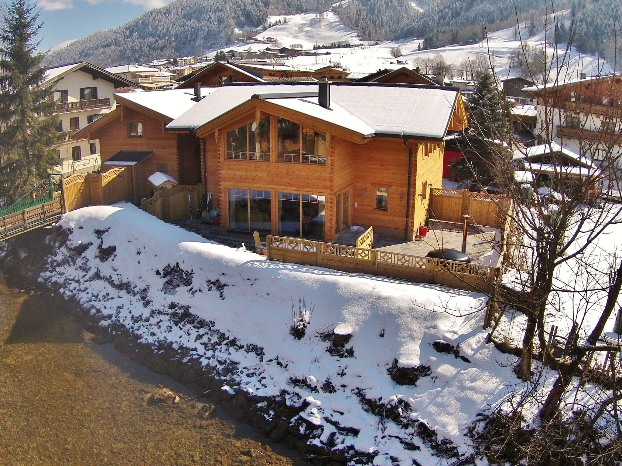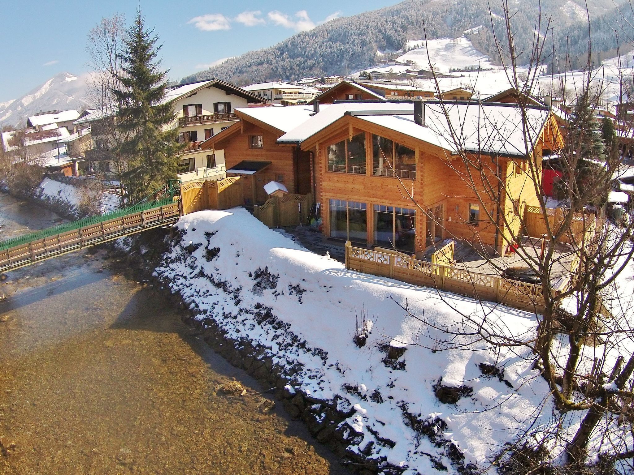 Enjoy a luxurious stay directly on a small river in the heart of Kaprun, complete with a terrace that guarantees a relaxing holiday. This wooden chalet has 5 bedrooms, accommodating up to 16 people, and offers the option of soaking in the warm water of the wooden outdoor tub or enjoying the warmth of the private sauna inside. Either way, fresh outdoor air and stunning views of the surrounding nature await Winter sports in Kaprun mean snow guarantee, coziness, and a wide range of possibiliti ...