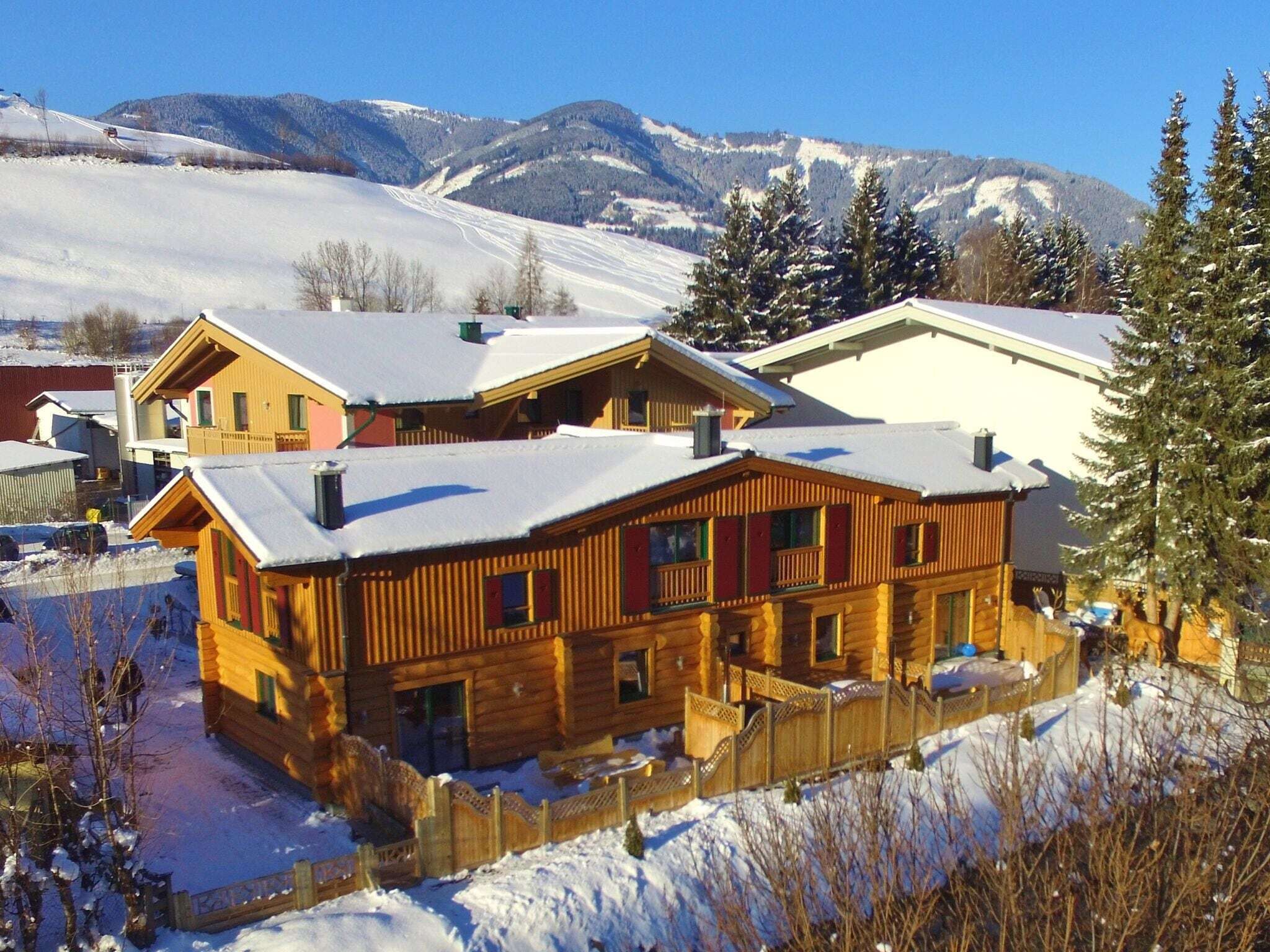 You will book a traditional Austrian-style chalet with a cozy living area and a Danish wood stove, a modern kitchen, 2 bathrooms and 3 separate bedrooms with double beds. The property includes a small garden with terrace.