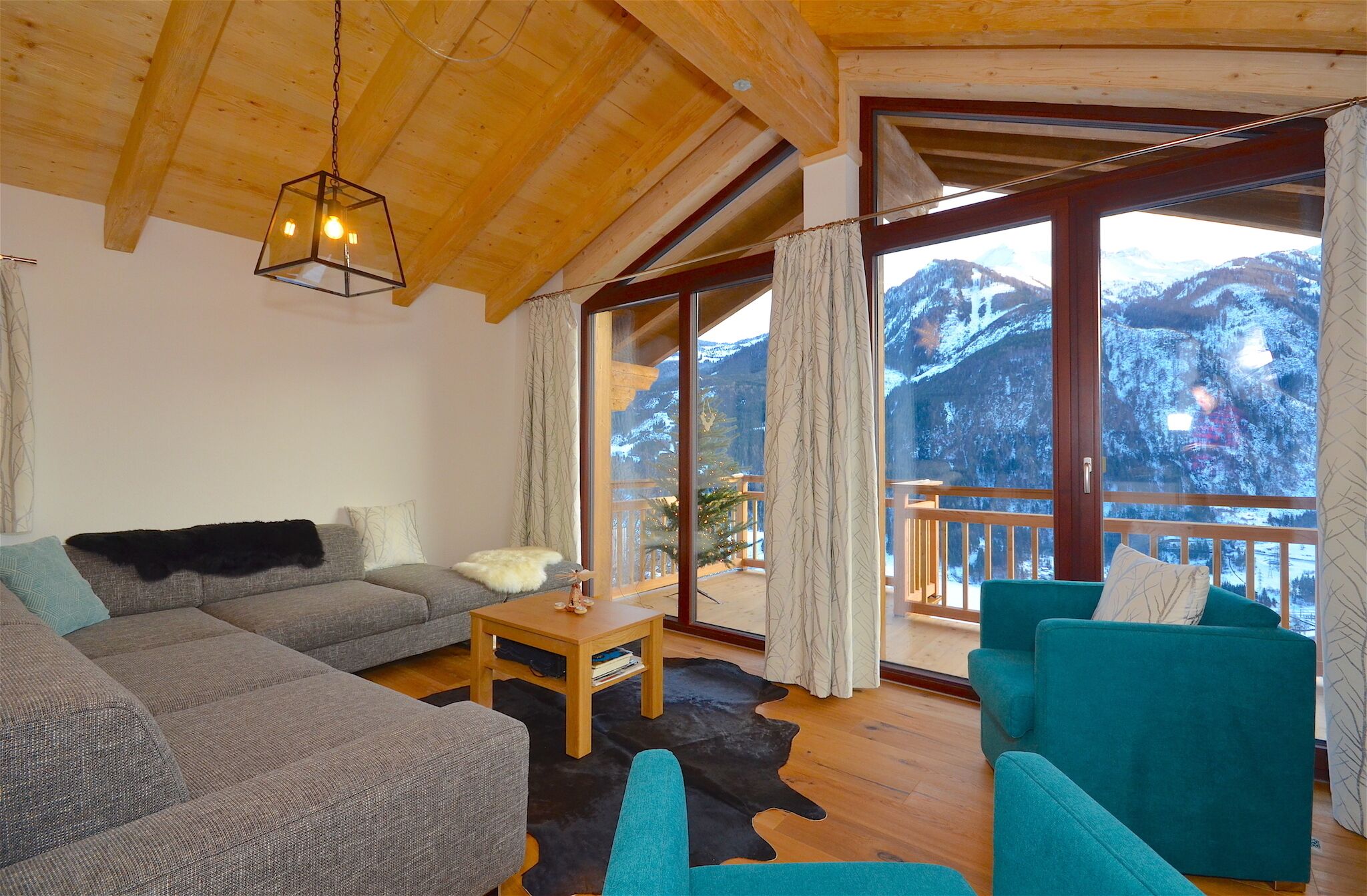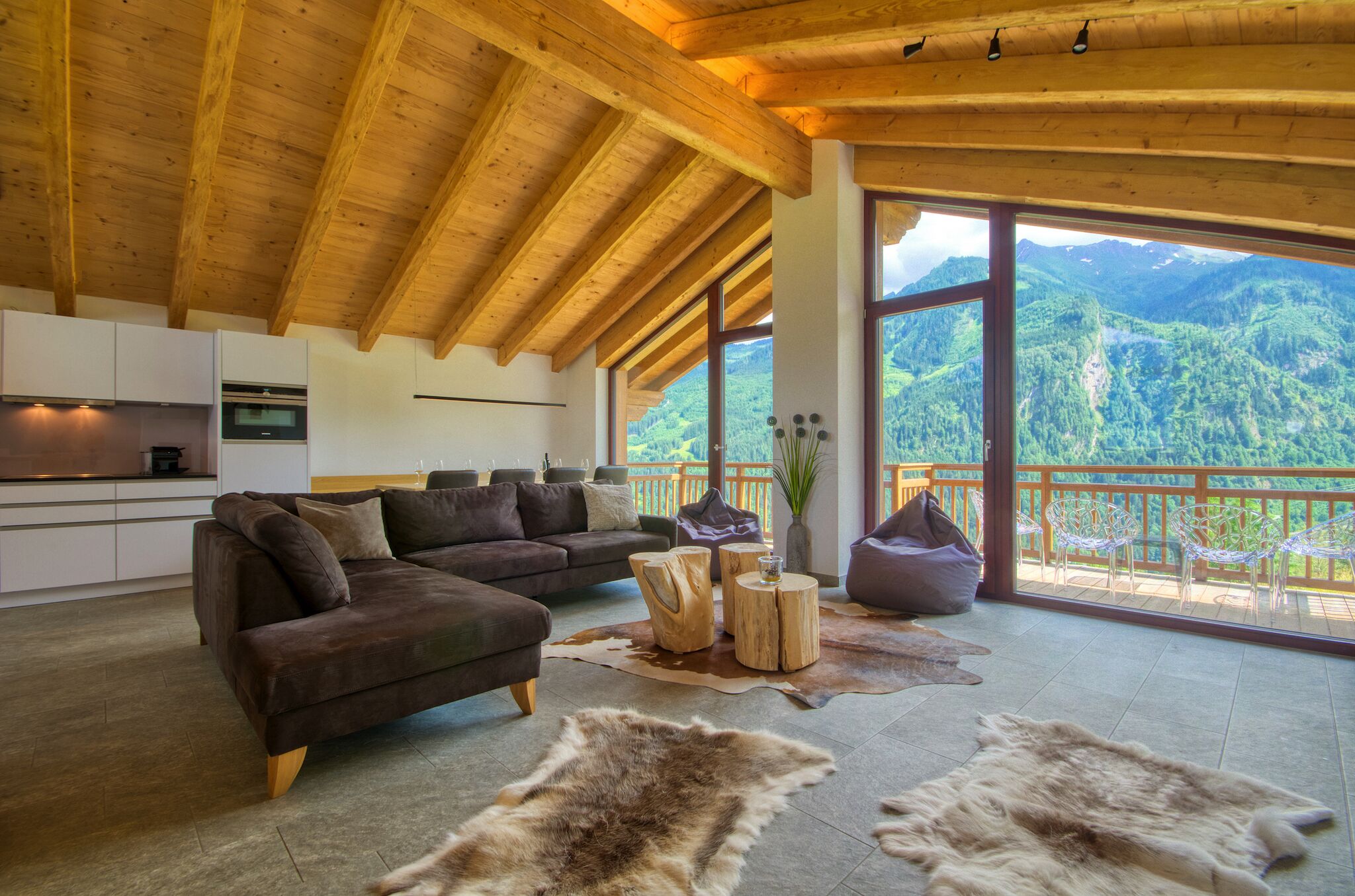 The approximately 40 square meters large covered porch is a real gem and opened a spectacular view over the rooftops of Kaprun and the impressive mountains.