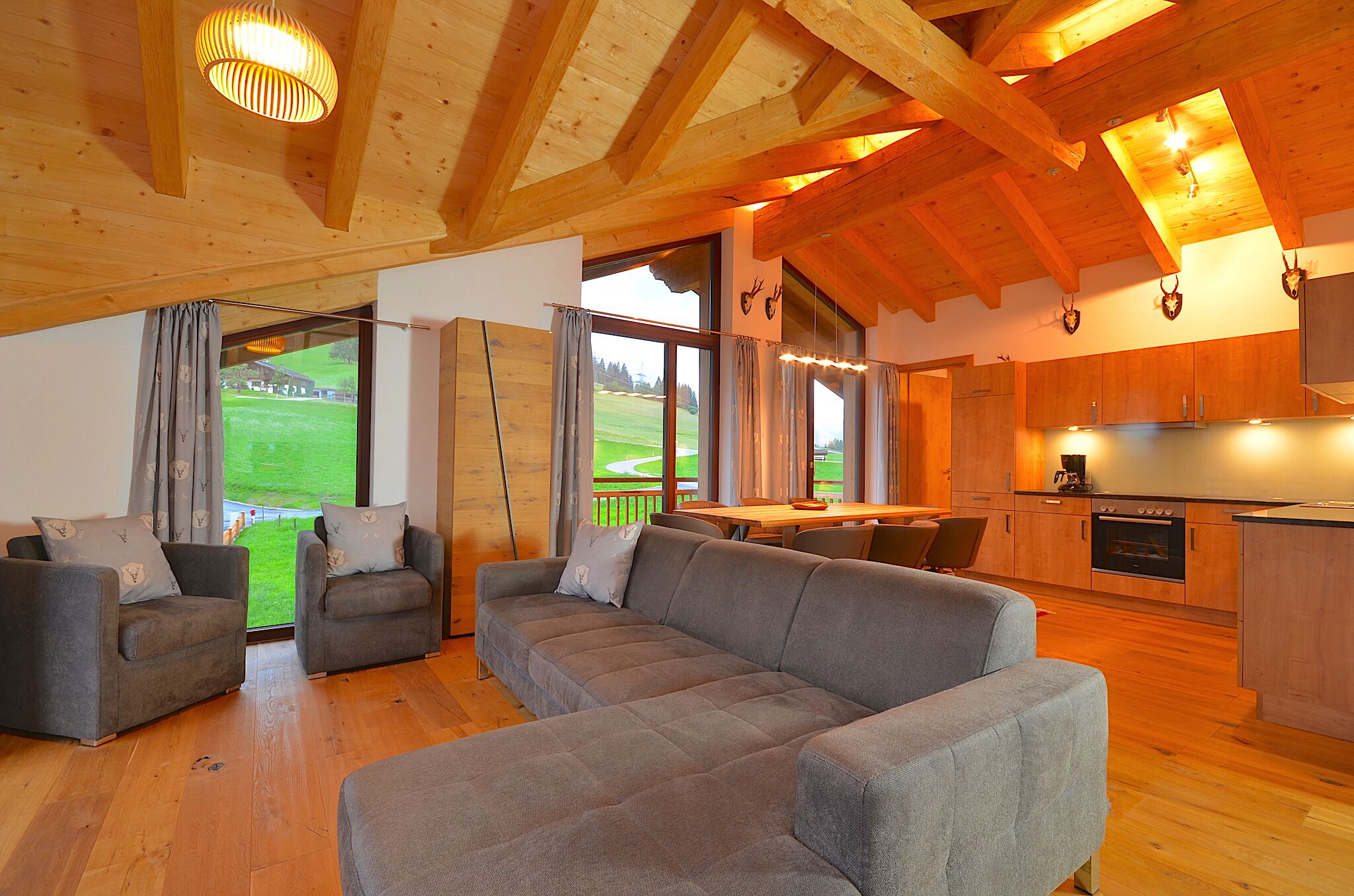 Opposite is the hunting room with spacious living / dining area, sofa, 40-inch Full HD TV and fireplace. Here and throughout the chalet are very discreetly positioned some real hunting trophies from the high alpine mountains.
