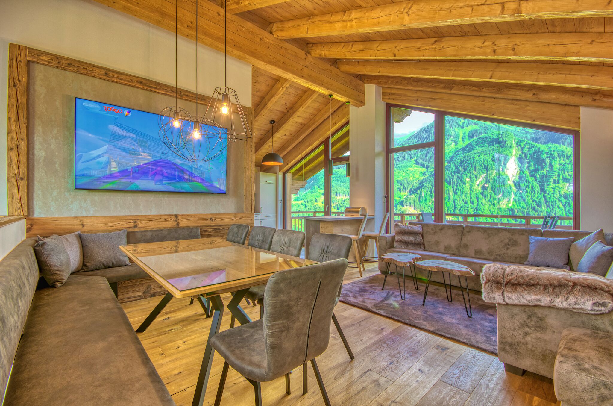 Lots of wood, fine fabrics (from Karl Weber Interior Design on site) and a warm color concept give the chalet a touch of alpine cosiness - combined with a modern, urban touch. No compromises were made in terms of furnishings and fittings: solid wood cabinet-maker furniture, first-class innerspring beds, Sonos sound system in the living rooms and much more!