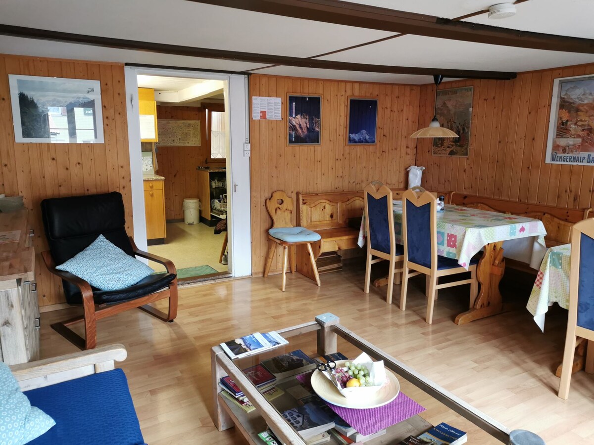 Upper floor: wardrobe, open living room with separate dining area, kitchen (oven, dishwasher, 4 glass ceramic hobs, toaster, kettle, Nespresso machine, milk frother, fondue sets and much more), panoramic window with picturesque views of Eiger/Mönch and Jungfrau, open fireplace, cable TV, balcony, 1 bedroom with double bed (180 cm wide, 200 cm long), 1 children's room with bunk bed (90 cm wide, 200 cm long), bathroom with sink, toilet and shower (hairdryer, towels for use), separate toilet.