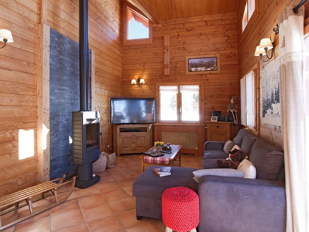 including a living room with TV, WiFi internet access, DVD player, and wood stove, logs available, sofa bed, beautiful open kitchen, dishwasher, washing machine, 1 bedroom with 140x190 bed, 1 bedroom with 2 beds in 90X190, 1 bedroom with 2x2 bunk beds, 1 bedroom with 2 double beds, 3 bathrooms, 3 independent toilets, large garden 200 sqm, mountain view, close to the slopes, 1 parking space in front of the chalet. Other public spaces will be available on the street