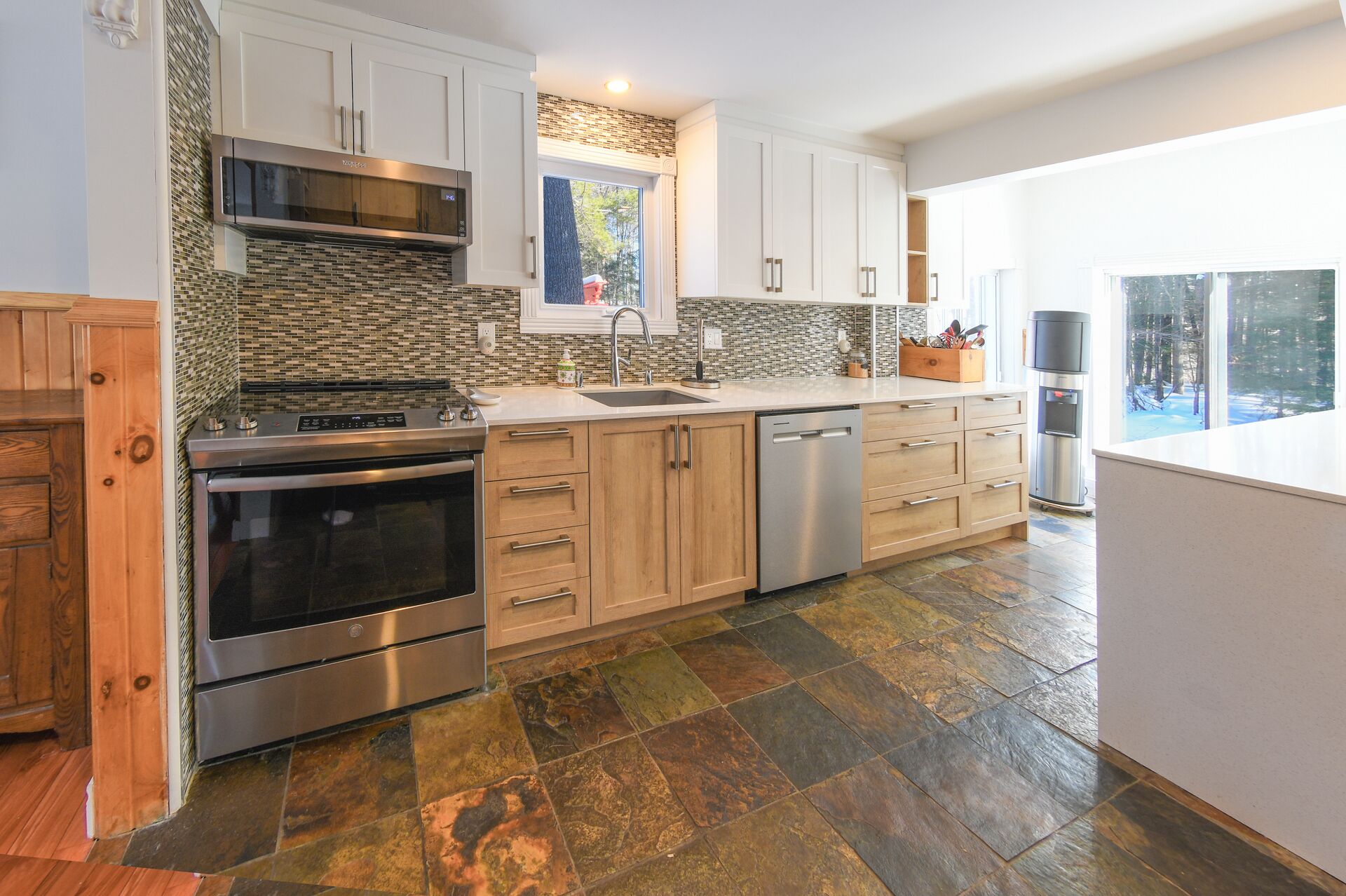 This beautiful property decorated to taste includes 3 bedrooms, two of which have their own bathrooms, an additional full bathroom, a spacious living room with stone fireplace, fully equipped kitchen, and a 4 season veranda for sunshine intake! A newly renovated walk-out floor has a projector for cinema nights, a game table, and direct access to the beach and outdoor areas! Its perfect for a family getaway, or a friends get together !