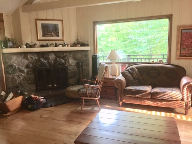 a living room with wood burning fireplace, 65" LED Smart TV with Boose sound bar and wired high speed Wi-fi;