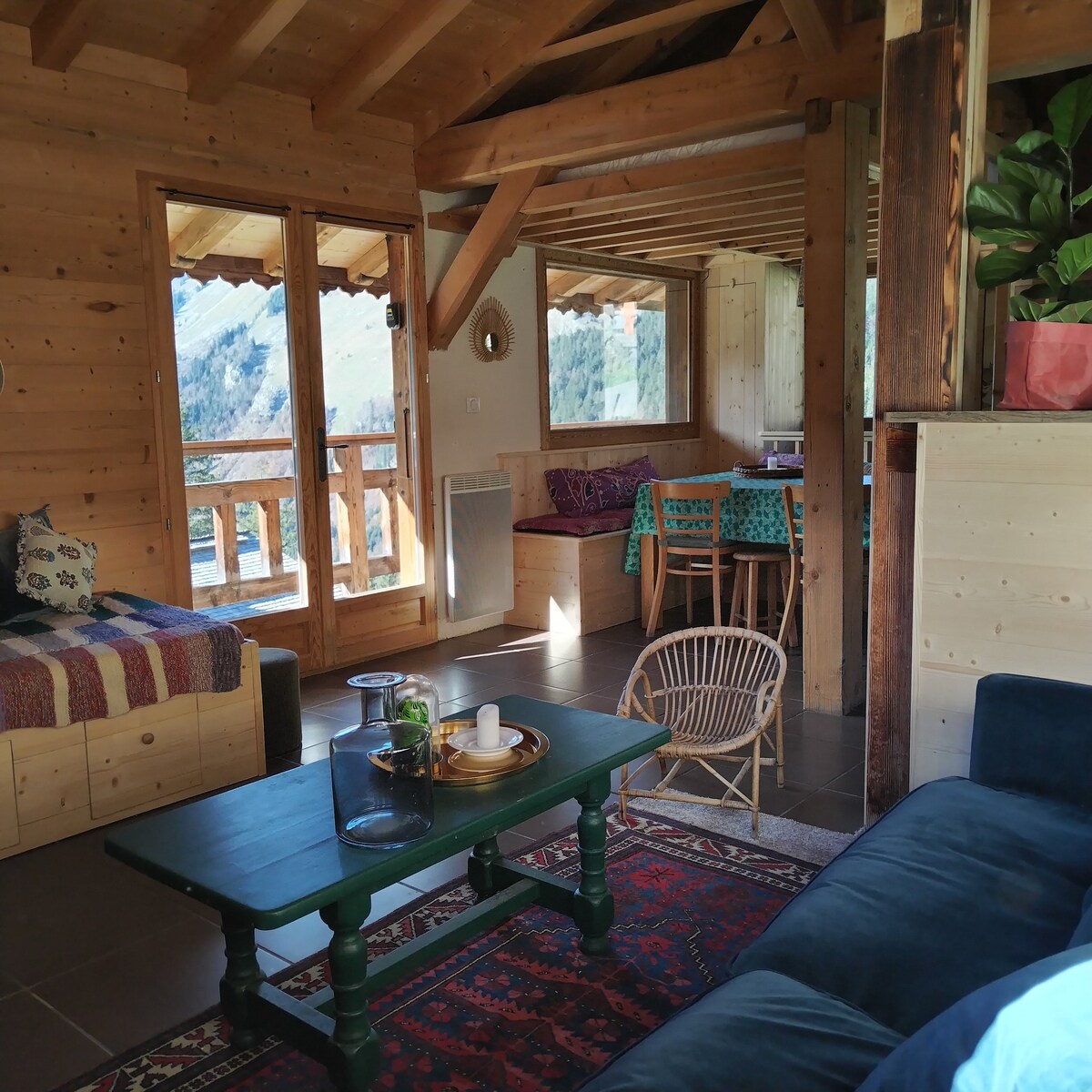 The chalet is located at the edge of a small track which joins the domain, we open the door, we put on the skis and presto, let's go! It is the ideal point to discover the pleasures of the mountains, winter and summer. Lively during the day, completely isolated at night, you will feel privileged in this magical place!