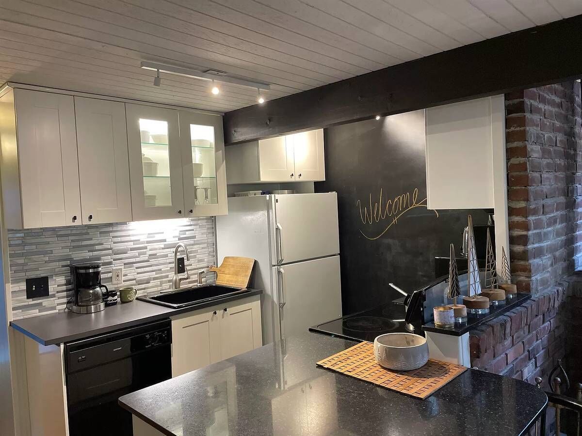 A fully renovated kitchen with all the amenities, including a dishwasher, brand new stove and range hood, coffee maker, Microwave, fridge, toaster .... and a waffle maker!