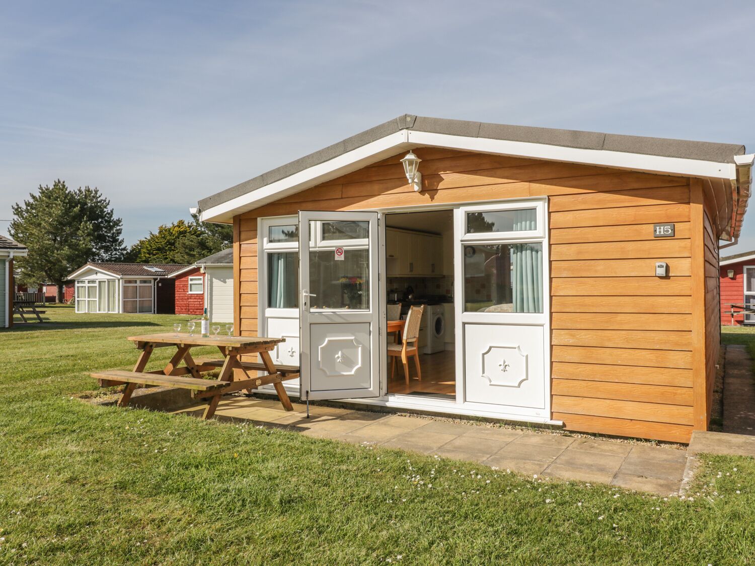 Chalet H5 is a comfortable, detached lodge located on the Atlantic Bays Holiday Park in St Merryn, near Padstow in Cornwall. The chalet can sleep five people in one double and one triple bunks room with a double below and single on top. There is also a family bathroom with bath, shower over, basin and WC. The rest of the lodge is made up of an open plan living area with a fitted kitchen, dining area and sitting area. To the outside of the lodge is off road parking for one car and a patio area to the front with furniture. Chalet H5 can be enjoyed throughout the year.