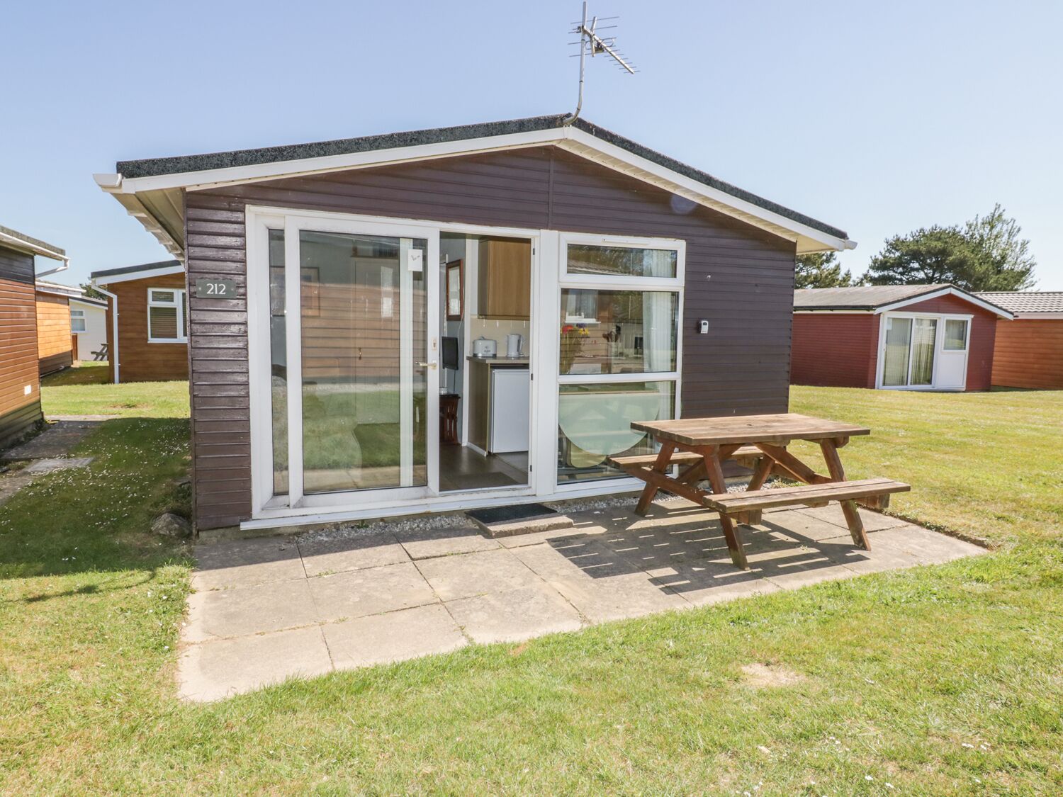 Chalet 212 is a comfortable, detached lodge located on the Atlantic Bays Holiday Park in St Merryn, near Padstow in Cornwall. The chalet can sleep five people in one double and one triple bunks room with a double below and single on top. There is also a family bathroom with bath, shower over, basin and WC. The rest of the lodge is made up of an open plan living area with a fitted kitchen, dining area and sitting area. To the outside of the lodge is off road parking for one car and a patio area to the front with furniture. Chalet 212 can be enjoyed throughout the year.