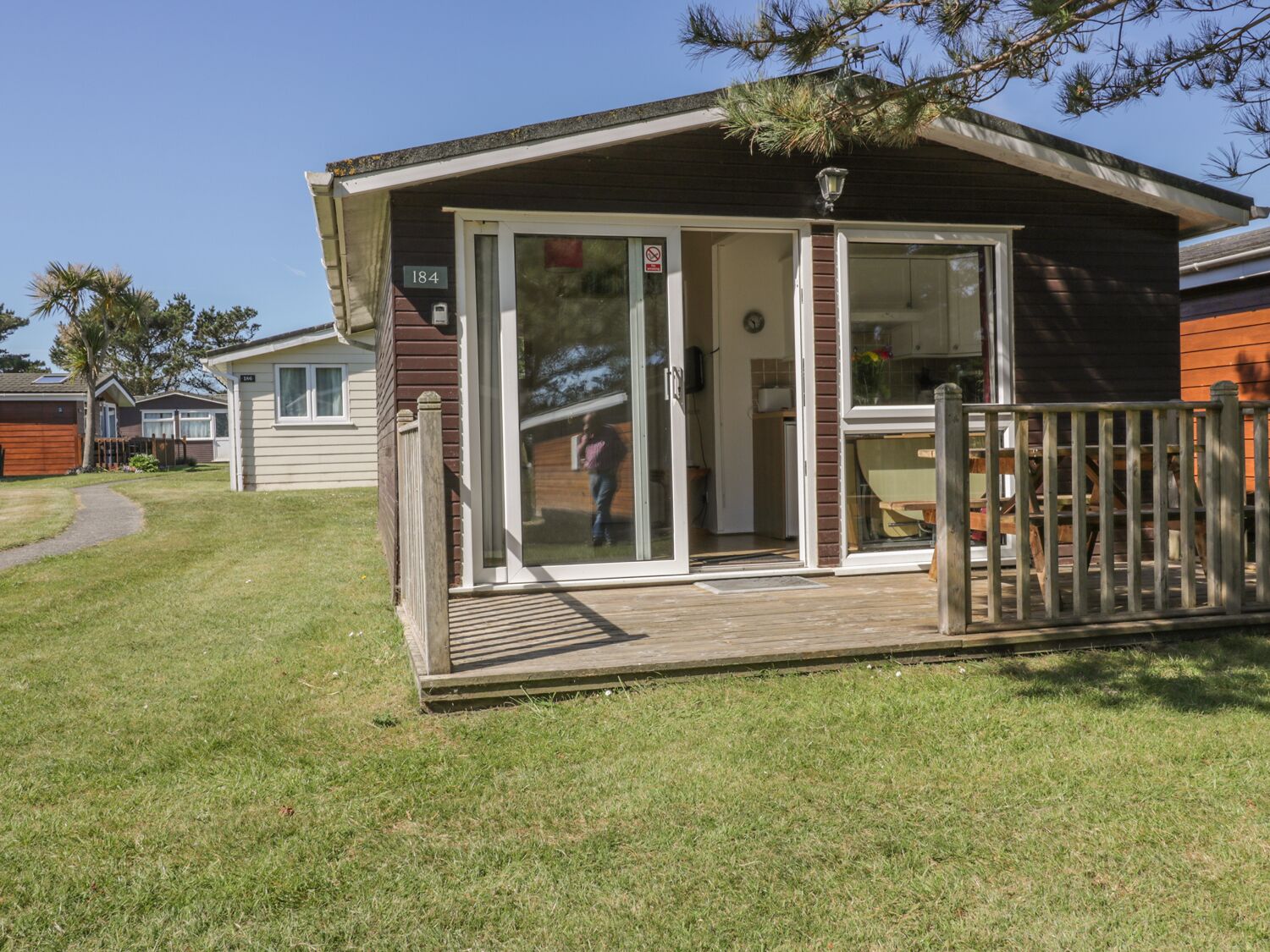 Chalet 184 is a comfortable, detached lodge located on the Atlantic Bays Holiday Park in St Merryn, near Padstow in Cornwall. The chalet can sleep five people in one double and one triple bunks room with a double below and single on top. There is also a family bathroom with bath, shower over, basin and WC. The rest of the lodge is made up of an open plan living area with a fitted kitchen, dining area and sitting area. To the outside of the lodge is off road parking for one car and a patio area to the front with furniture. Chalet 184 can be enjoyed throughout the year.