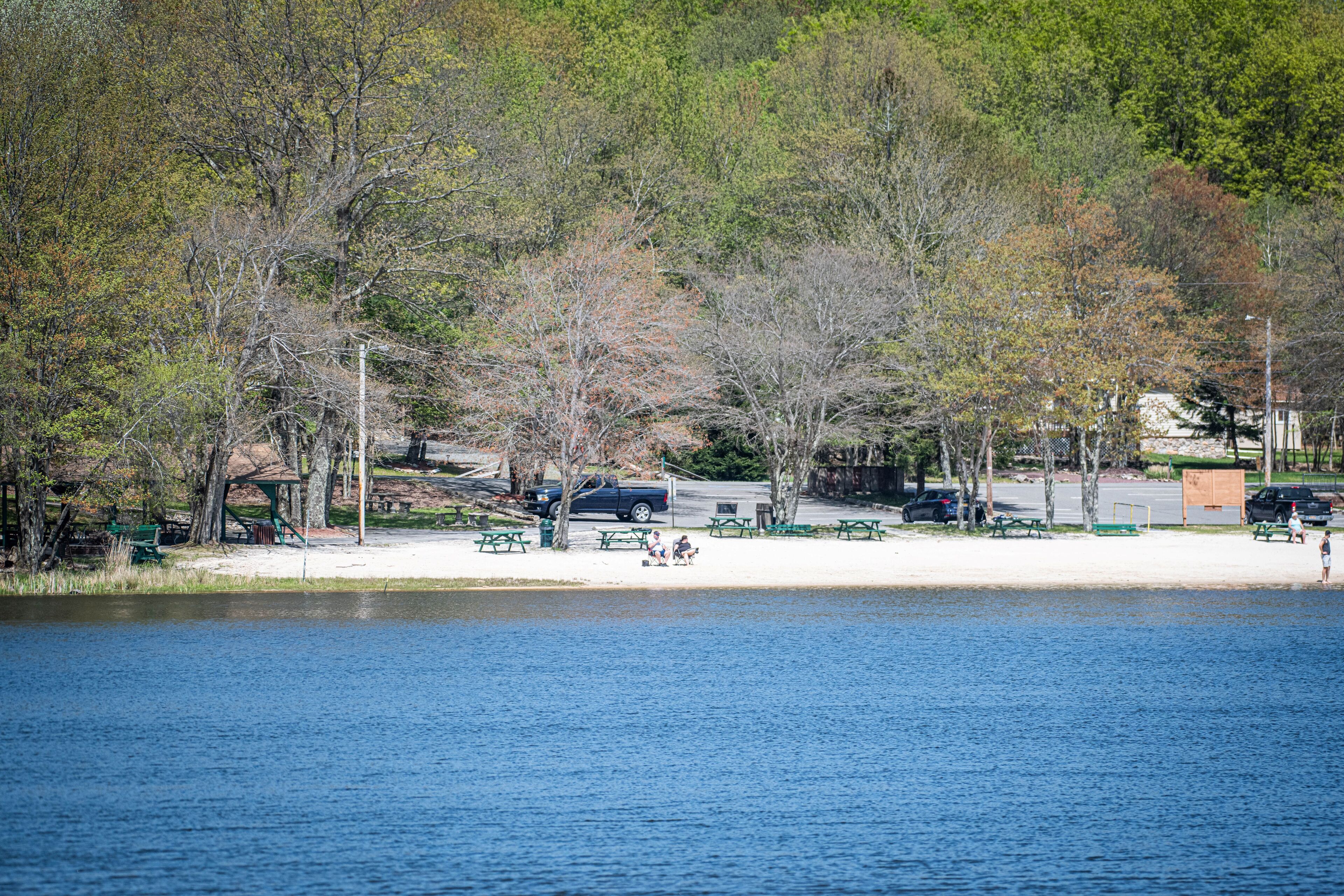 Our Lake Harmony Estates beach is more private and located a short drive next to our parking area, canoe, and community house. There you will find a lake swimming area, sandy beach, picnic tables, and beach volleyball. Our canoe is located there and free to our guests.