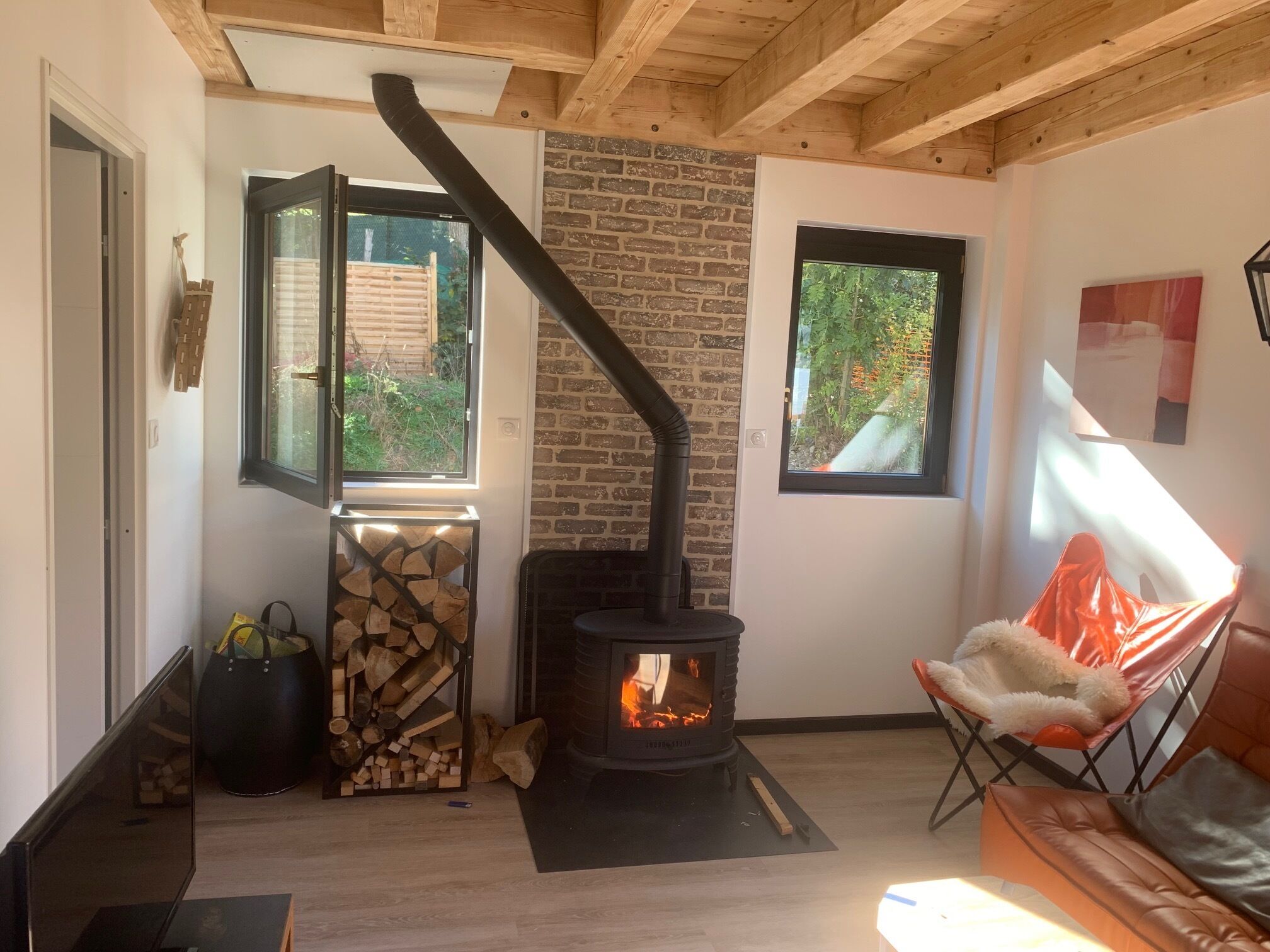 Bright living room with two large floor-to-ceiling windows, wood stove, big screen sofa TV