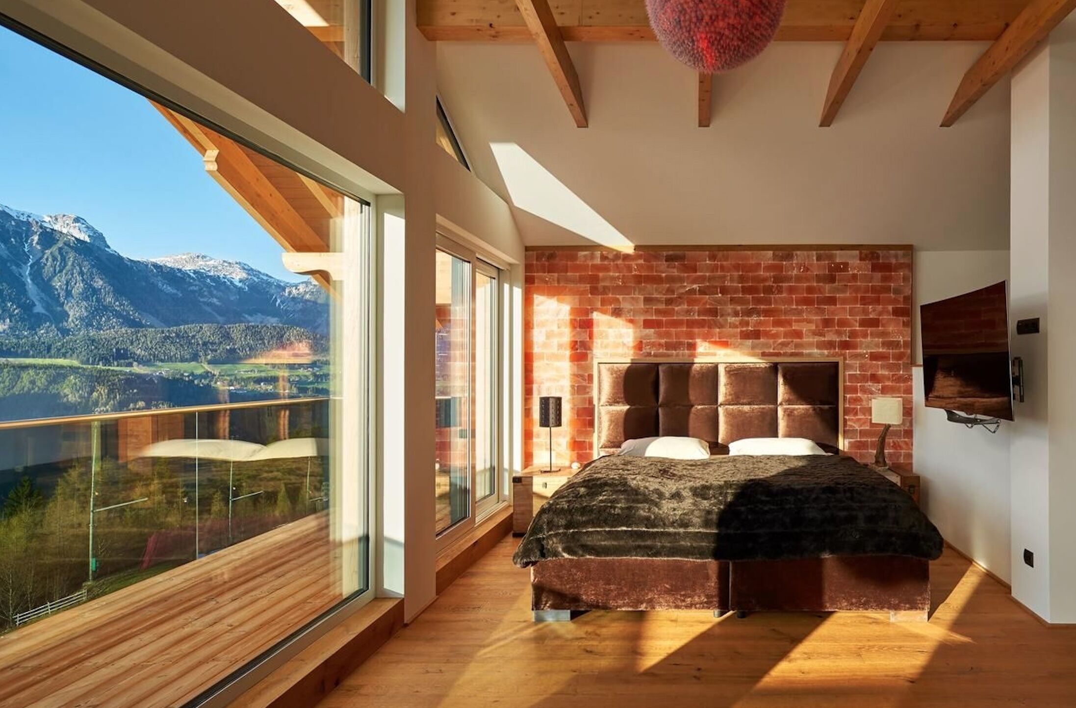 On the top floor, large sliding doors invite you to fully enjoy the impressive mountain scenery.