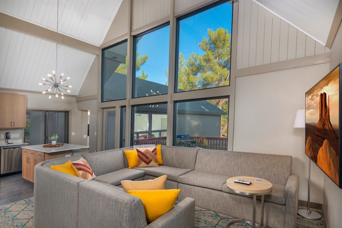 Upon entering this thoughtfully crafted Chalet, you will be welcomed by an open concept living space adorned with modern furnishings and accents. The living room beckons you to relax by large windows that frame stunning views of Sedona's red rock landscapes, allowing the beauty of nature to become an integral part of your indoor experience.