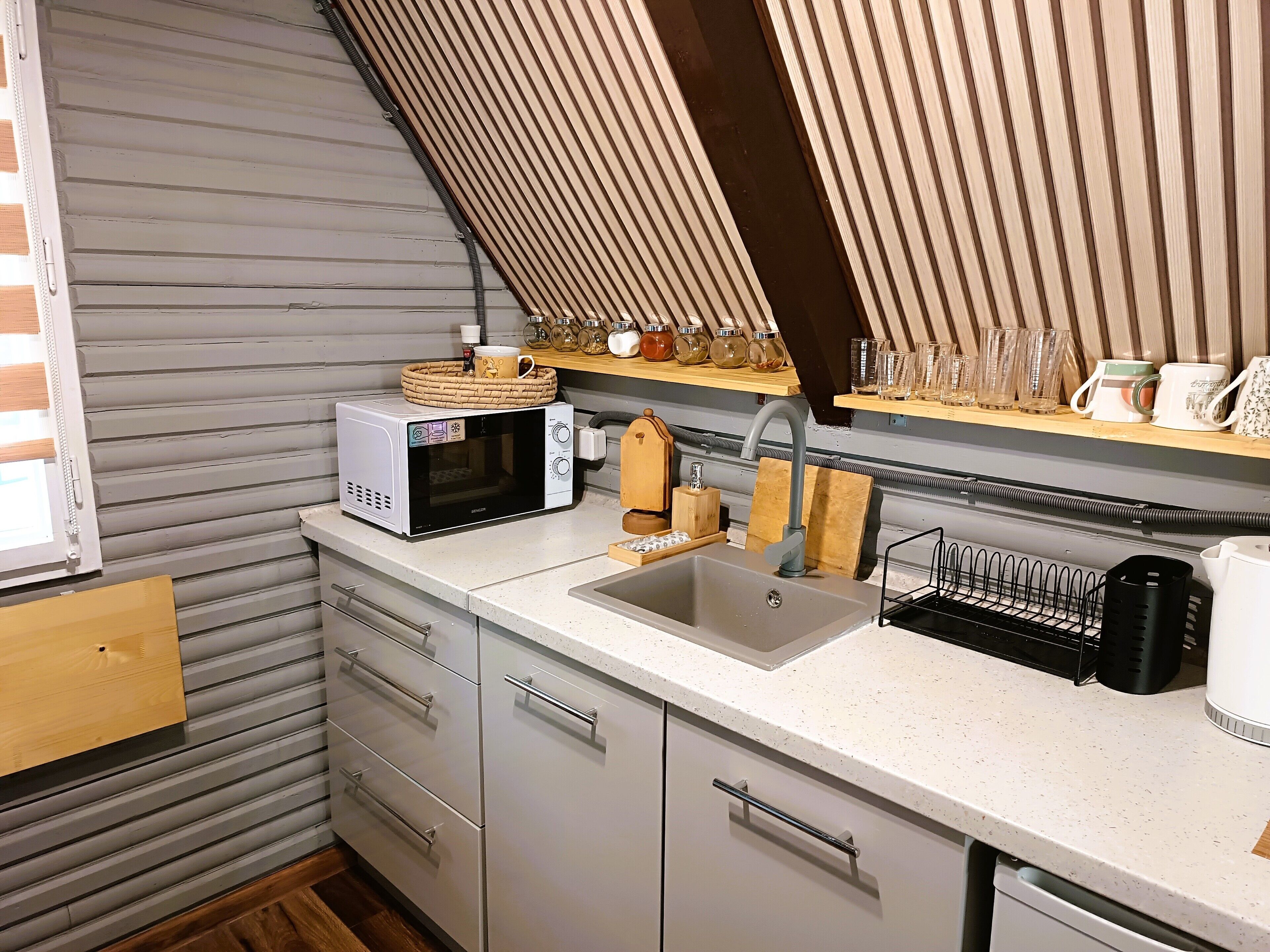 The kitchen is fully equipped with all the equipment you need to heat up food. We designed it to provide all creature comforts, but with an element of "cute".