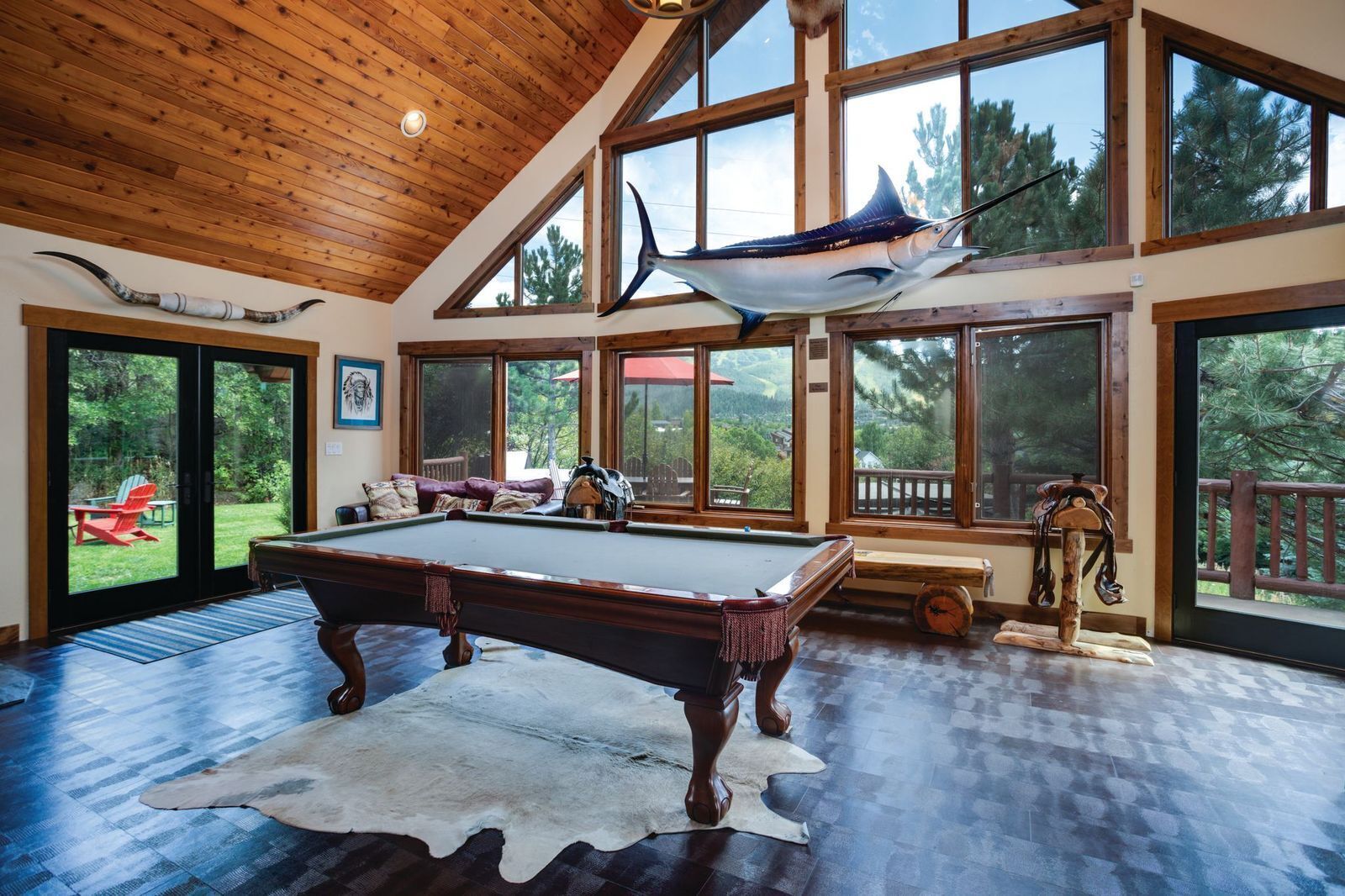 The Lower Level is a huge entertaining space and second Great Room with 30 foot ceilings, walls of windows and great views. This area includes a game room with air hockey, foosball, and a 1976 classic pinball machine. Adjoining the game room is a full bar and tv room. This level also accesses the private hot tub which enjoys views across the valley as well.