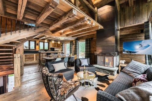 • Living area with fireplace, TV, sofa, and terrace with stunning views of Val d'Isère