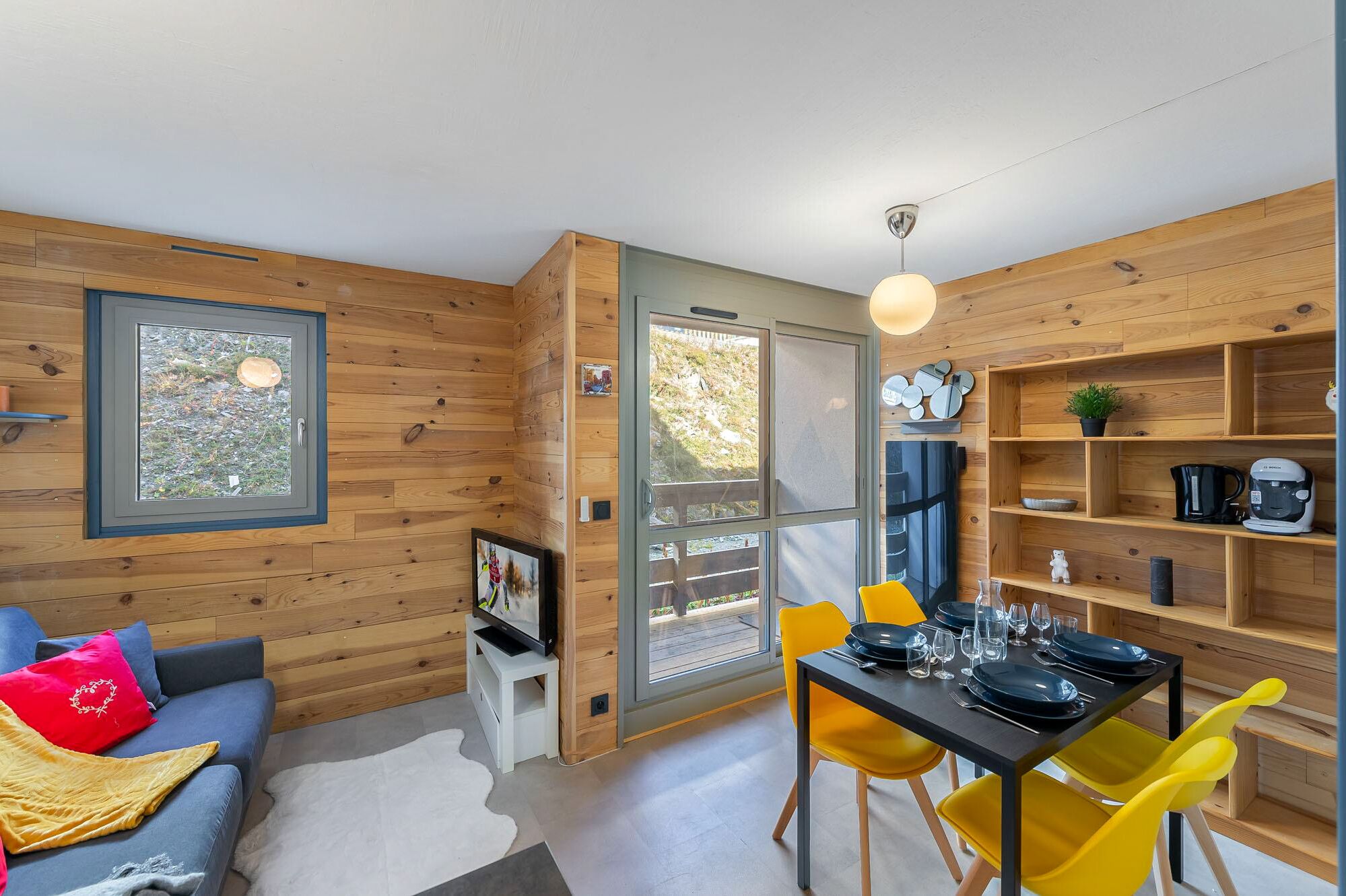 The apartment's decor combines dazzling white, light grey and a subtle blend of vibrant yellow, with warm wood elements to create a welcoming and lively atmosphere. This thoughtful design maximises comfort while embracing a modern aesthetic, ensuring you feel right at home in the mountains.