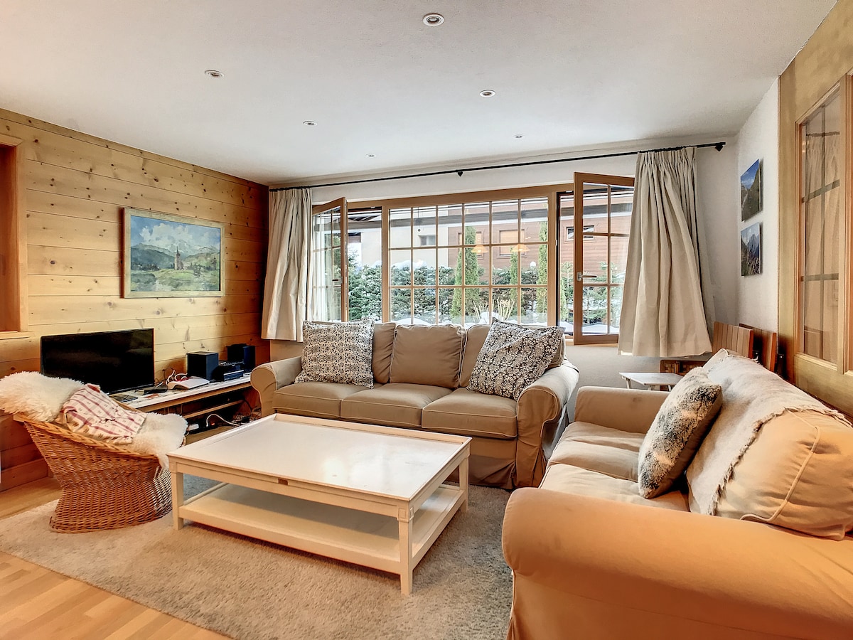 This spacious 4-room apartment is located on the ground floor of a chalet in the Moulins district. It includes a bright living room with TV and dining area, a fully equipped open kitchen and a bedroom with a double bed and direct access to the terrace. The sleeping area is completed with a bedroom equipped with bunk beds and a single bed, as well as a bedroom with two single beds. The apartment has a bathroom with bath, a shower room washing machine and dryer, as well as a separate toilet.
