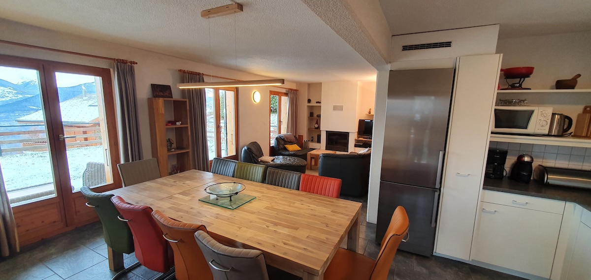 Our chalet is newly renovated, modern and comfortably furnished. 71 steps lead you from the parking lot to the chalet. Enjoy the magnificent view of the Rhône valley from the dining table or the large terrace.