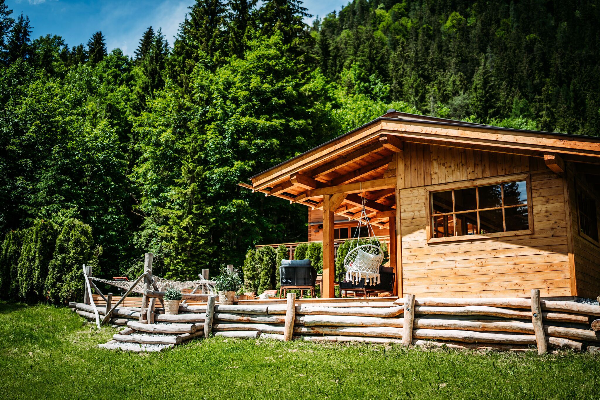 The in-house sauna on the upper floor ensures absolute relaxation after an active day in the mountains. The spacious garden is another highlight of the chalet: in summer, guests can enjoy the heated outdoor pool (5x10 metres), while sun loungers, lounge furniture and cosy seating areas invite you to relax. A pool house with a spacious terrace can also be found in the outdoor area.