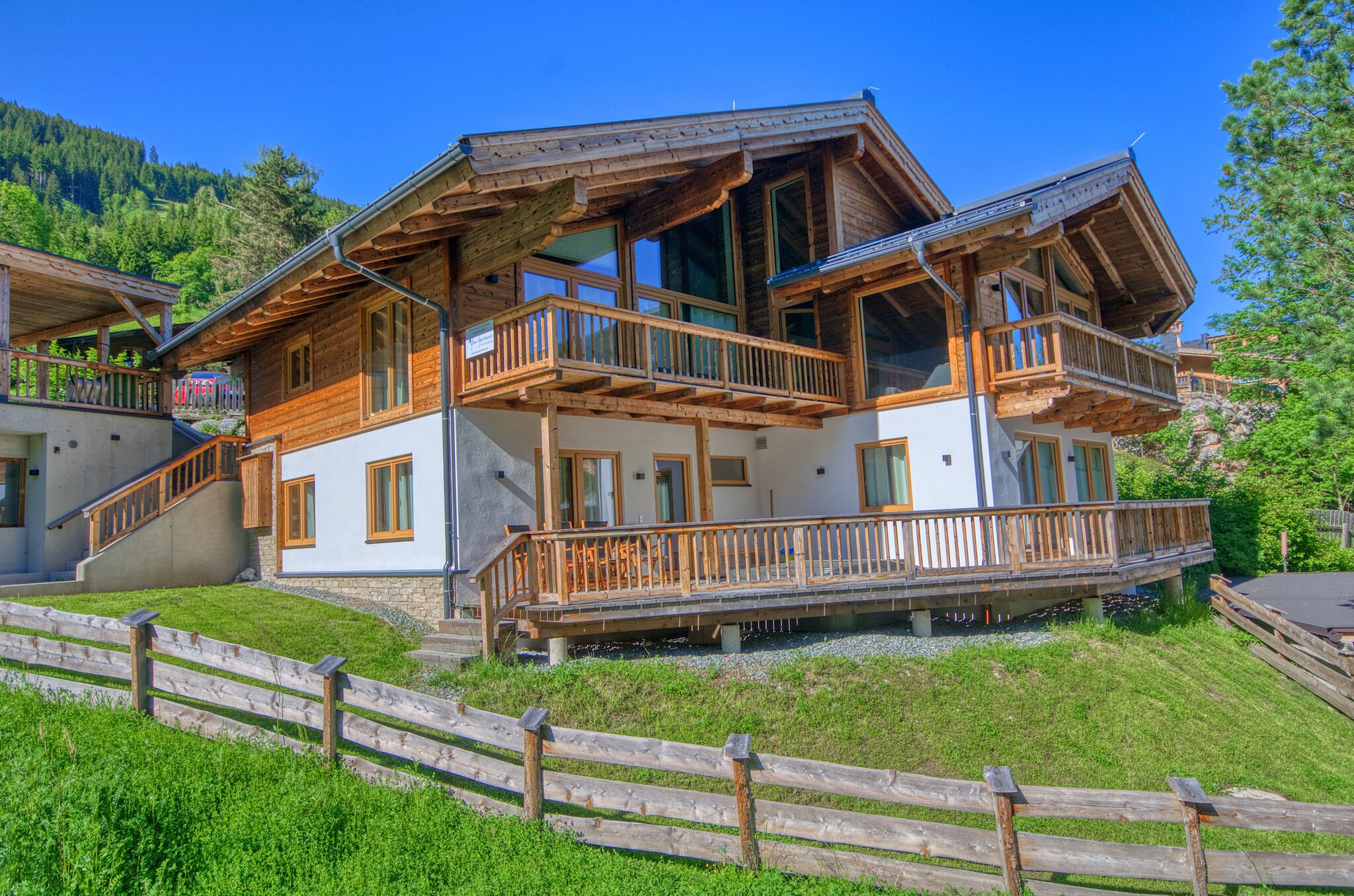 Superior Chalet. Lake view, garden. 3 bedrooms. 3 bathrooms. 190sqm. 1 - 12 person. Spend unforgettable days in Zell am See in our Chalet Max Panorama and reserve directly with the owner at the best price.A designer chalet in a dream location in Zell am See with an all-round panoramic view.The modern chalet is located just 1 kilometer from the center of Zell am See. Surrounded by untouched nature and beautiful forests, you can enjoy a view that is second to none on the 7500m² property in the nature reserve - from the Steinerne Meer in Saalfelden (north) to Lake Zell and the Imbachhorn (south), you have everything in view.Divided over 3 floors (ground floor, 1st floor, 2nd floor) there are 4 bedrooms with 4 TVs, 3 bathrooms, 2 kitchens, 2 terraces & 2 balconies.On the ground floor: the sun terrace with probably one of the most beautiful views in all of Zell am See.On the 1st floor: 3 bedrooms & 1 kitchen with dining area - 1st bedroom with double bed (160cm) and private bathroom with shower. 2nd bedroom with double bed (160cm). 3rd bedroom with double bed (140cm) and bunk bed. 2nd & 3 rd bedroom share one bathroom. On the 2nd floor: 1 master bedroom, kitchen with dining table for 12 people and living area with fireplace. The living room leads directly to the heated sun terrace with lounge furniture.In the kitchen: stove, oven, microwave, refrigerator, freezer, cutlery, toaster, dishwasher.Parking spaces: 4 outdoor parking spaces are available.Otherwise: washing machine & dryer availableThe access to the chalet is via a mountain road. The last 70 meters are very steep, so snow chains or a four-wheel drive car are recommended in winter!